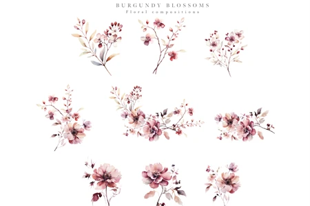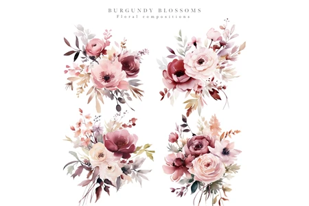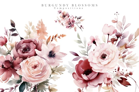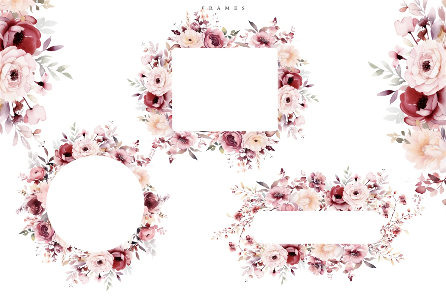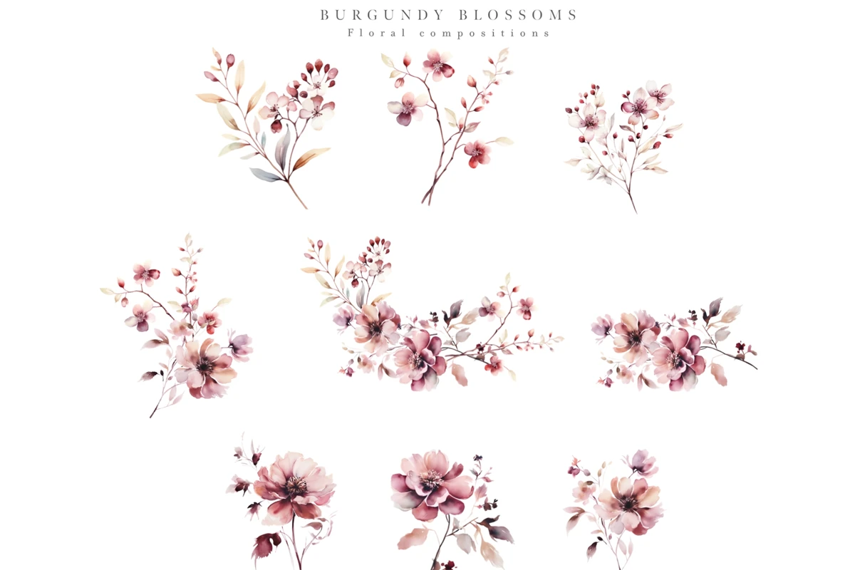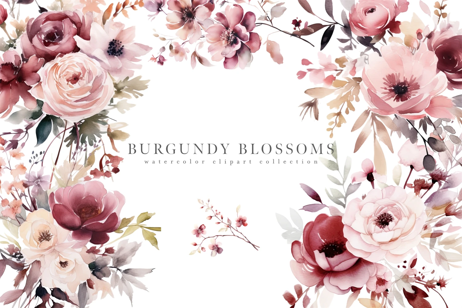 Watercolor burgundy and blush flowers clipart collection. These clipart images can be used for various creative purposes, such as designing invitations, greeting cards, posters, or other artistic projects that require a touch of nature-inspired beauty with a fall theme.
