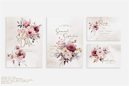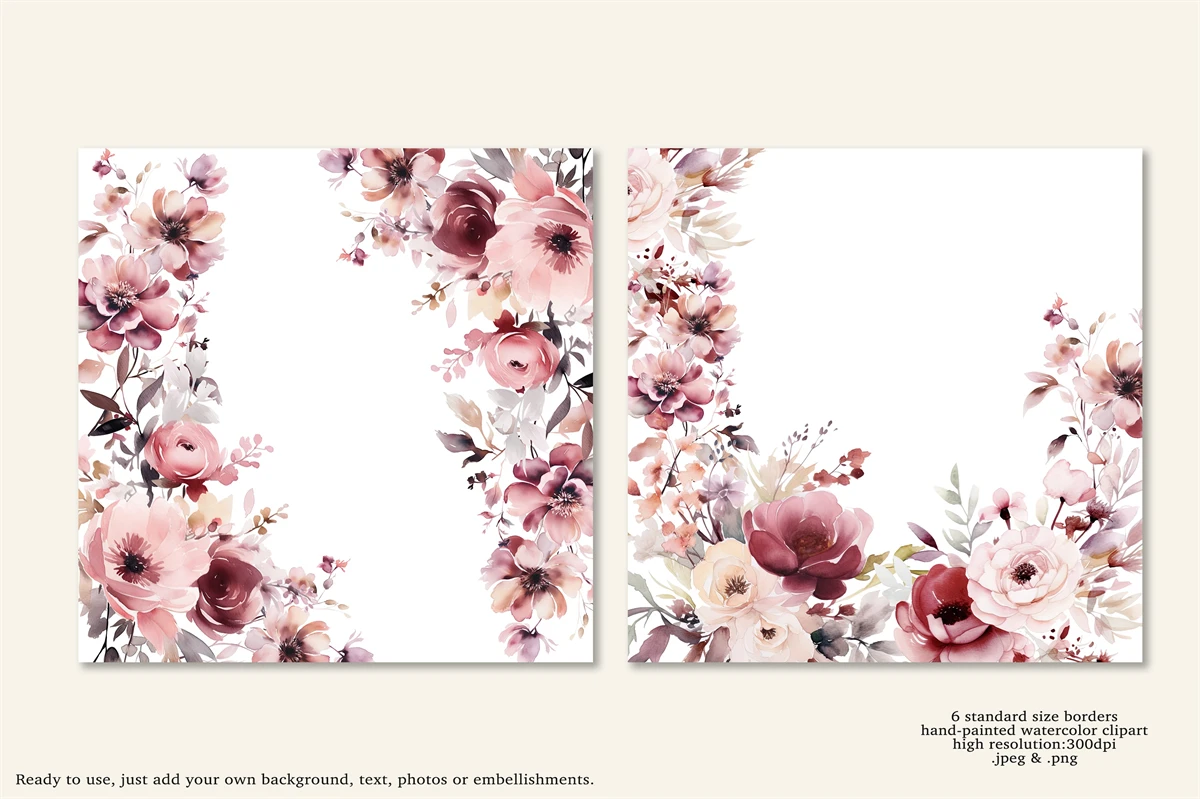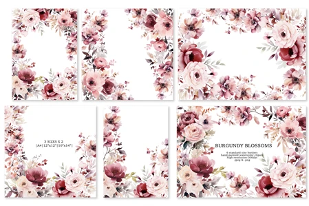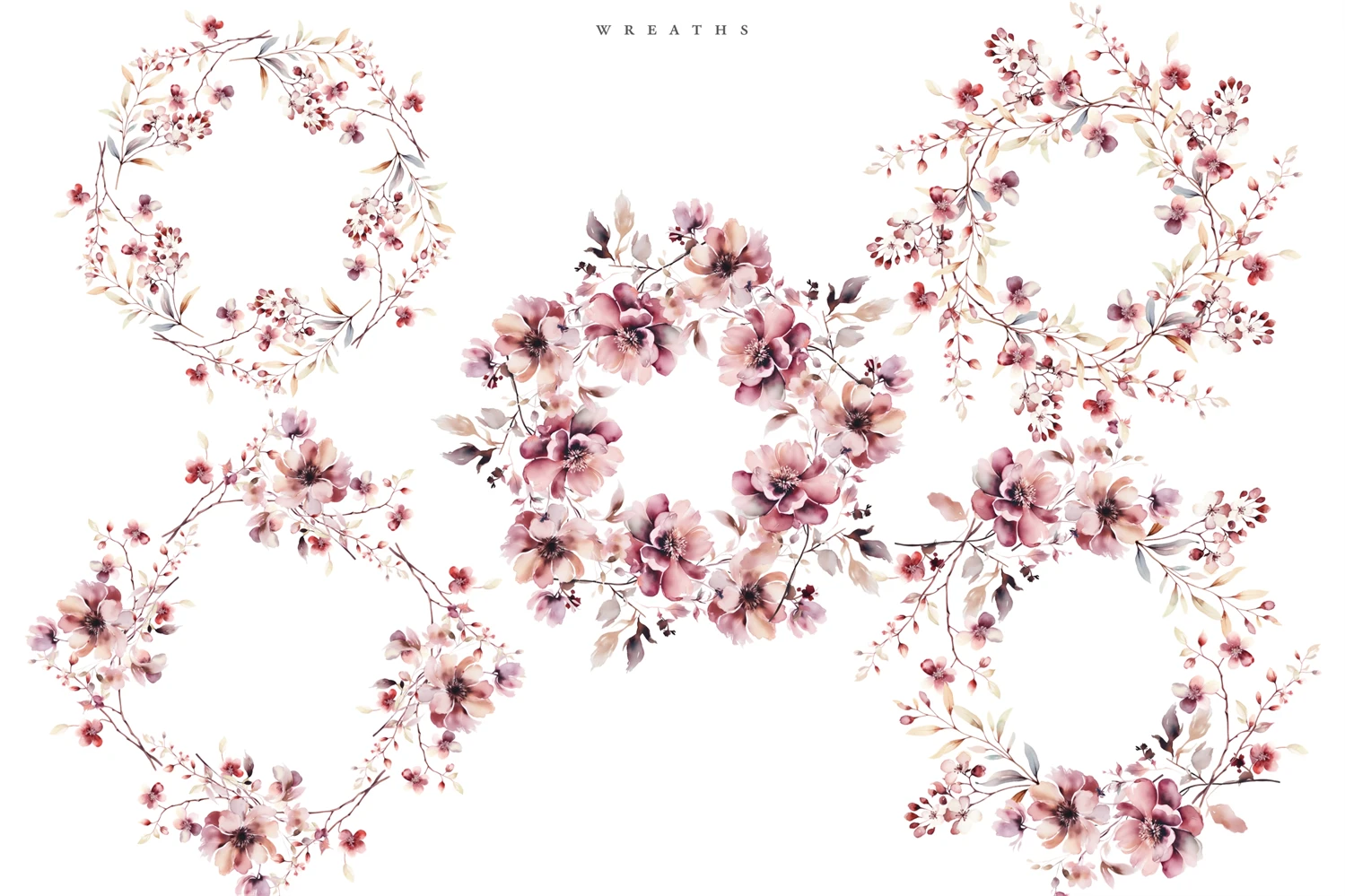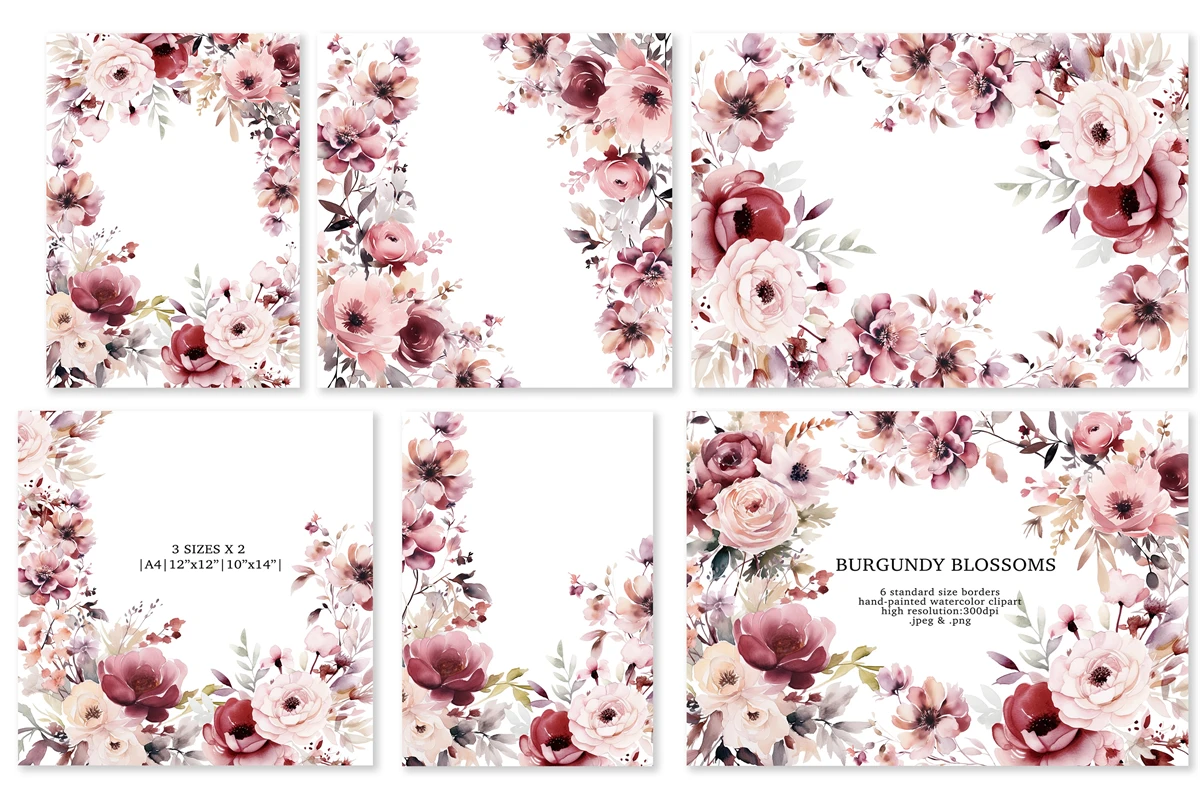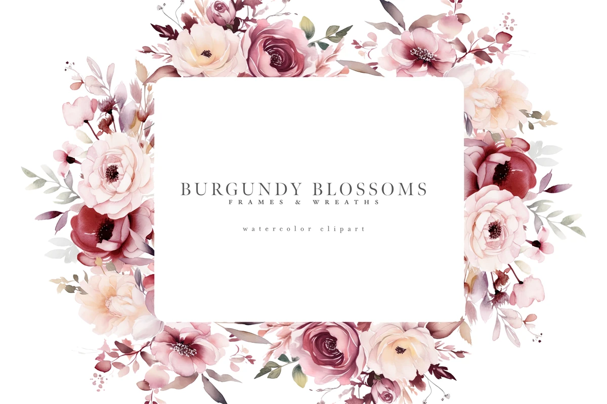 Watercolor burgundy and blush flowers clipart collection. These clipart images can be used for various creative purposes, such as designing invitations, greeting cards, posters, or other artistic projects that require a touch of nature-inspired beauty with a fall theme.