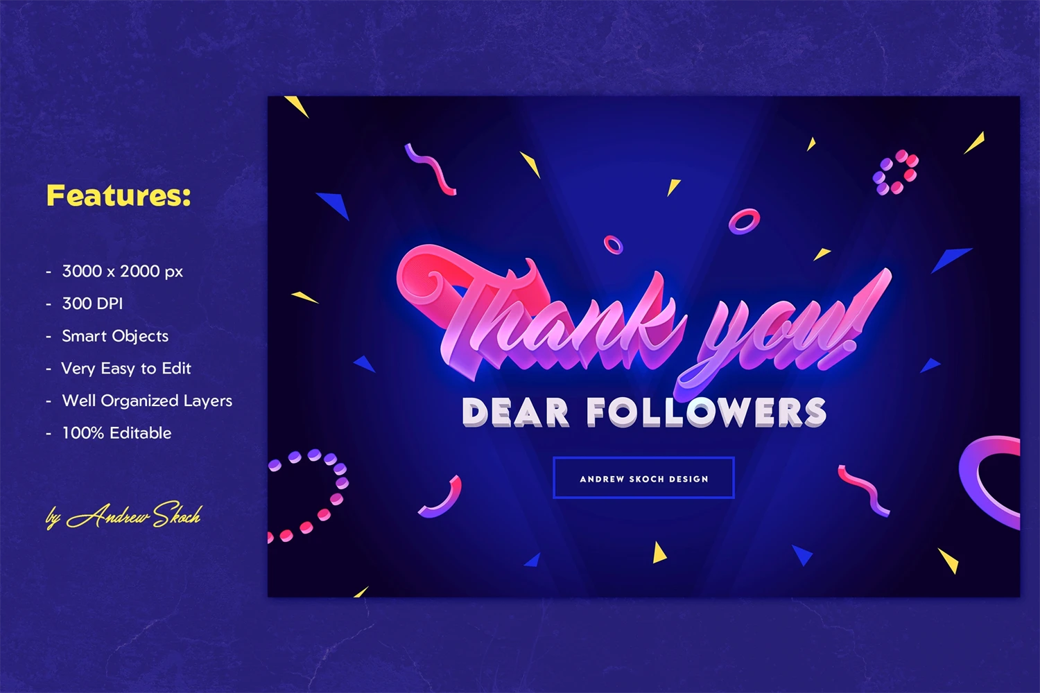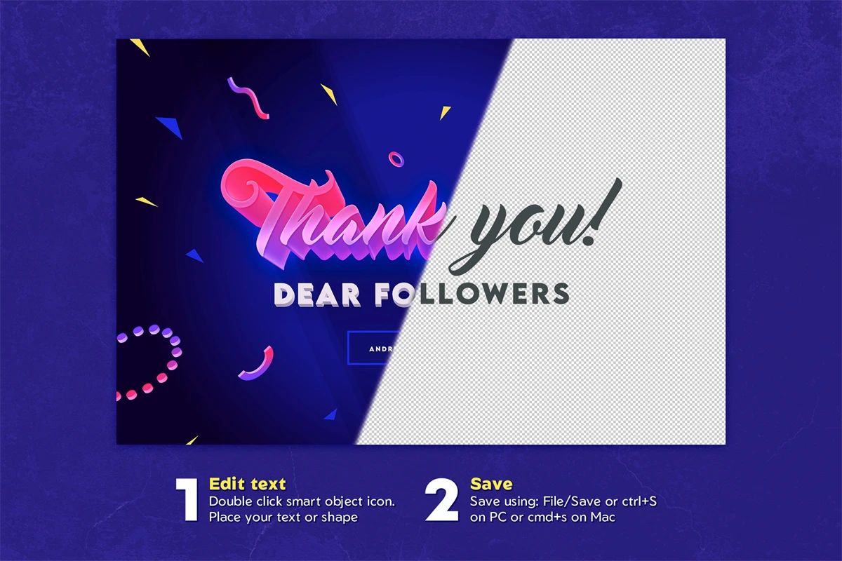 Great way to say 'Thank you' to your followers or customers! Main feature is that you can change the text to your own text. Works with any fonts - decorative or regular fonts. Looks good even with simple bold fonts.