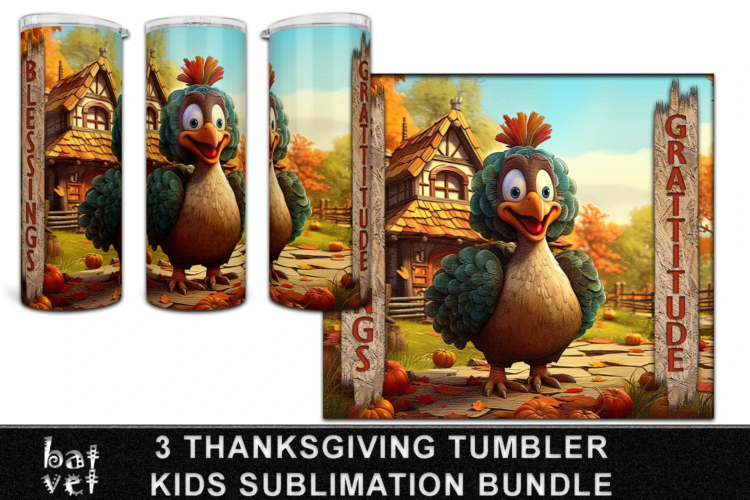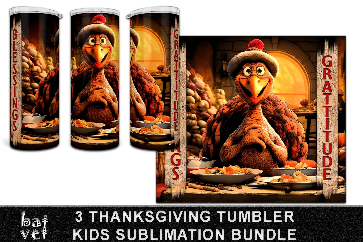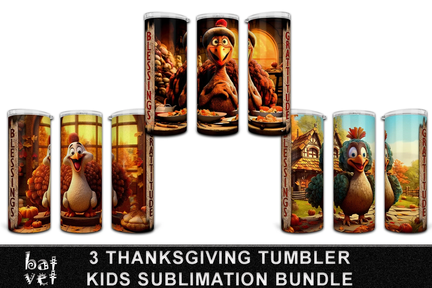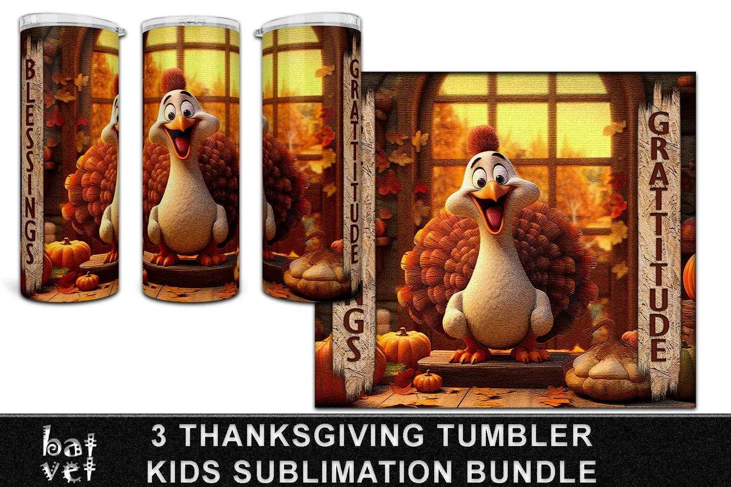 20 Oz Tumbler Wrap Thanksgiving Turkey, Blessings, Gratitude Sublimation Bundle.