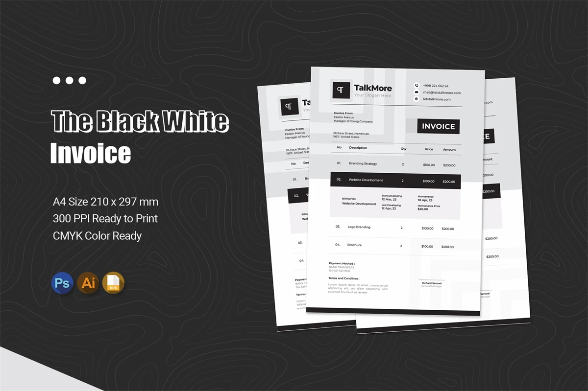 Use our invoices to make your bookkeeping easier and to impress your clients with an invoice display that has a modern, elegant design and strong typography. This invoice template is easy to use and customizable, making it perfect for any medium.
