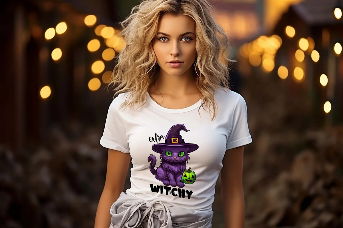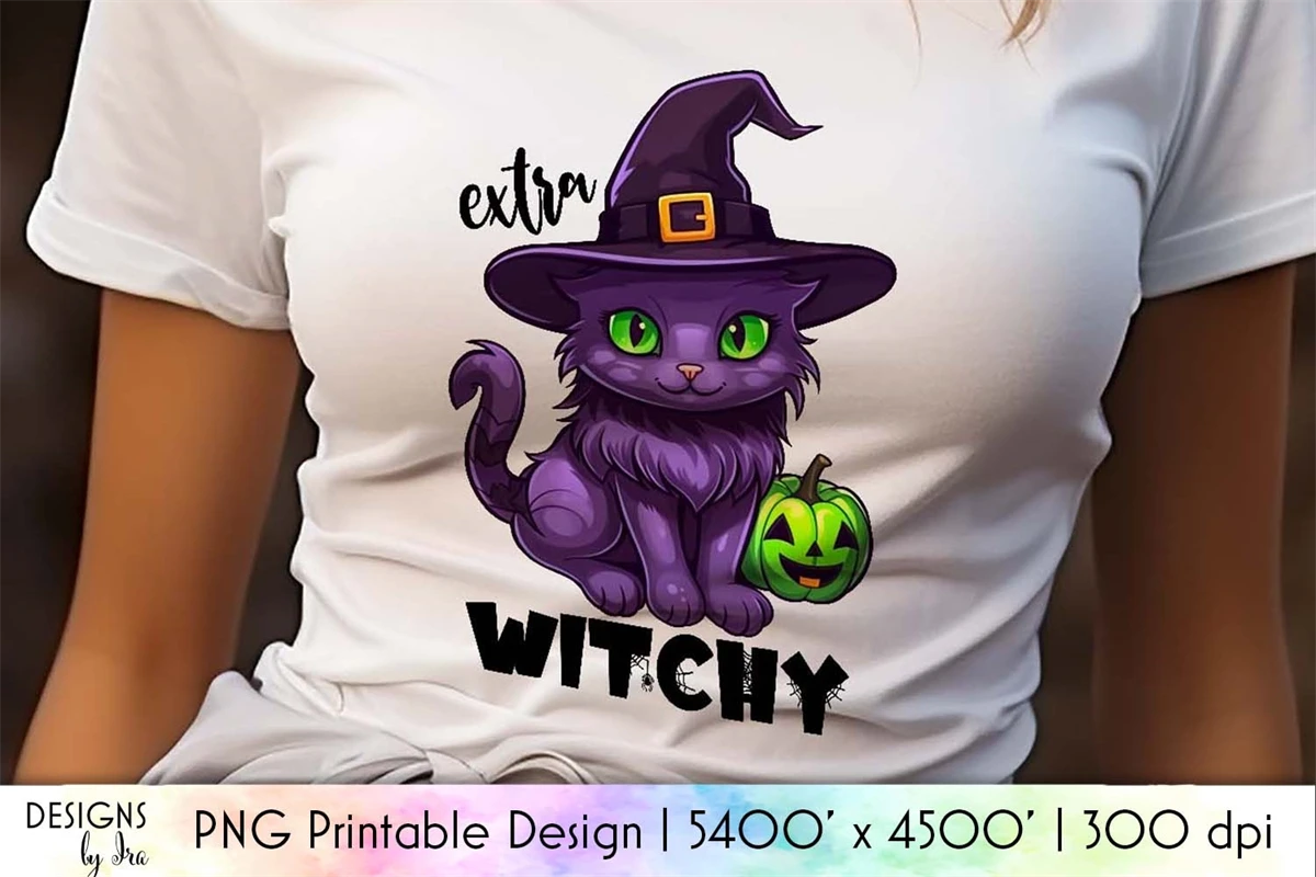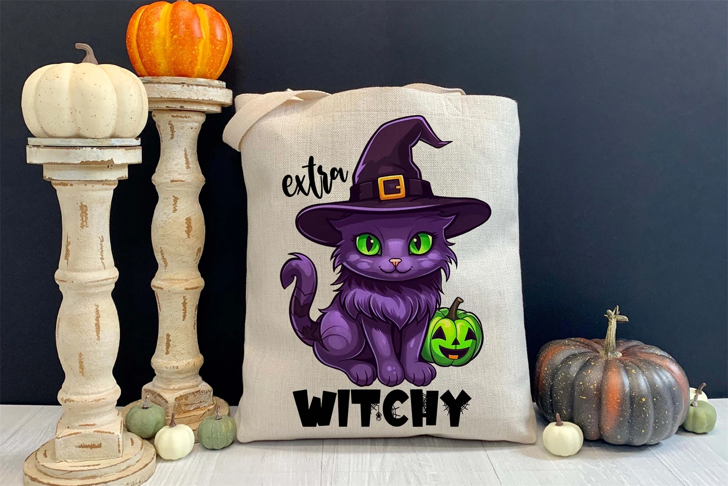 "Trick or Treat" - Halloween illustration of a cute cat in witch hat with pumpkins.