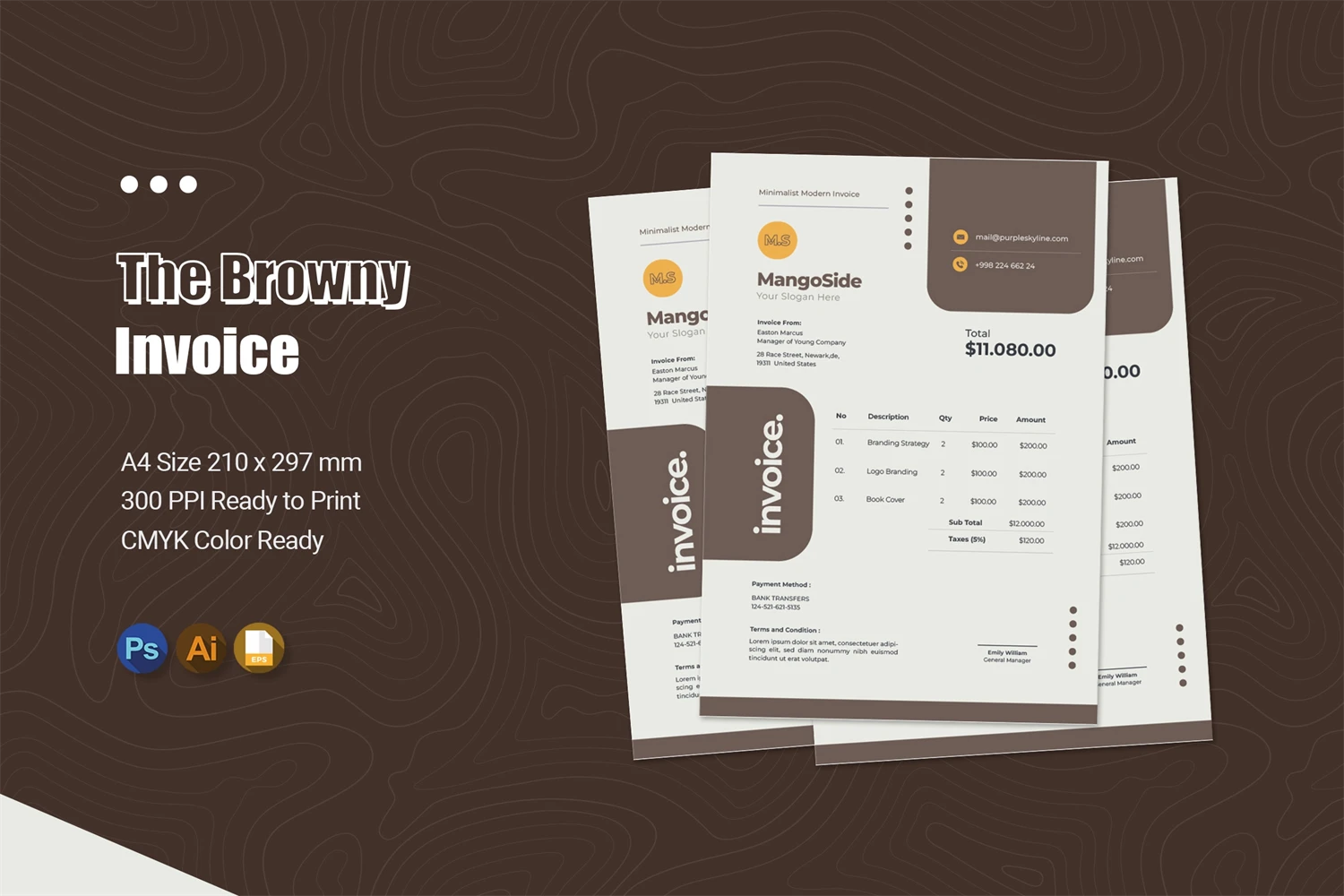 Use our invoices to make your bookkeeping easier and to impress your clients with an invoice display that has a modern, elegant design and strong typography. This invoice template is easy to use and customizable, making it perfect for any medium.