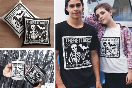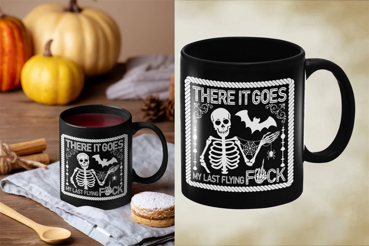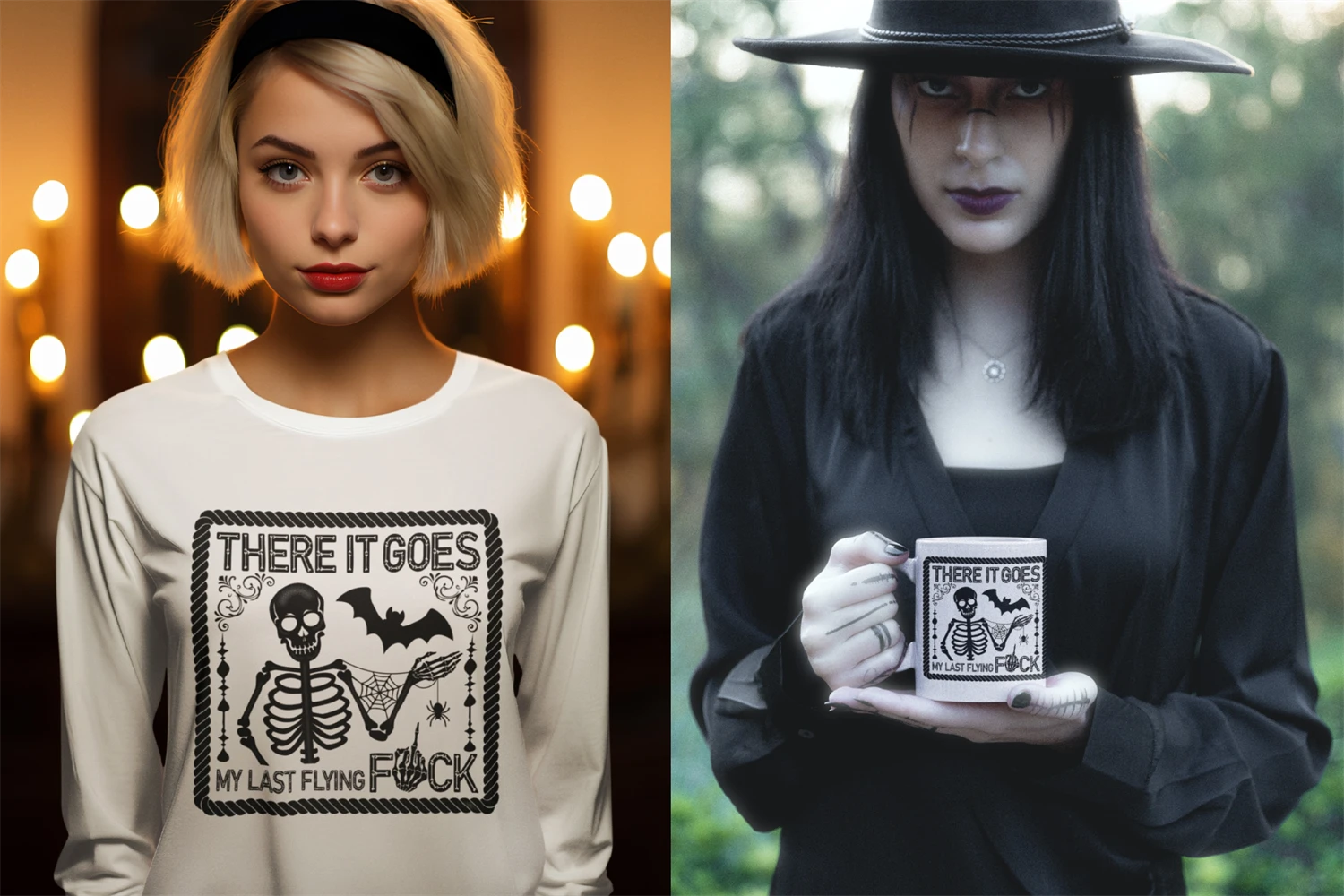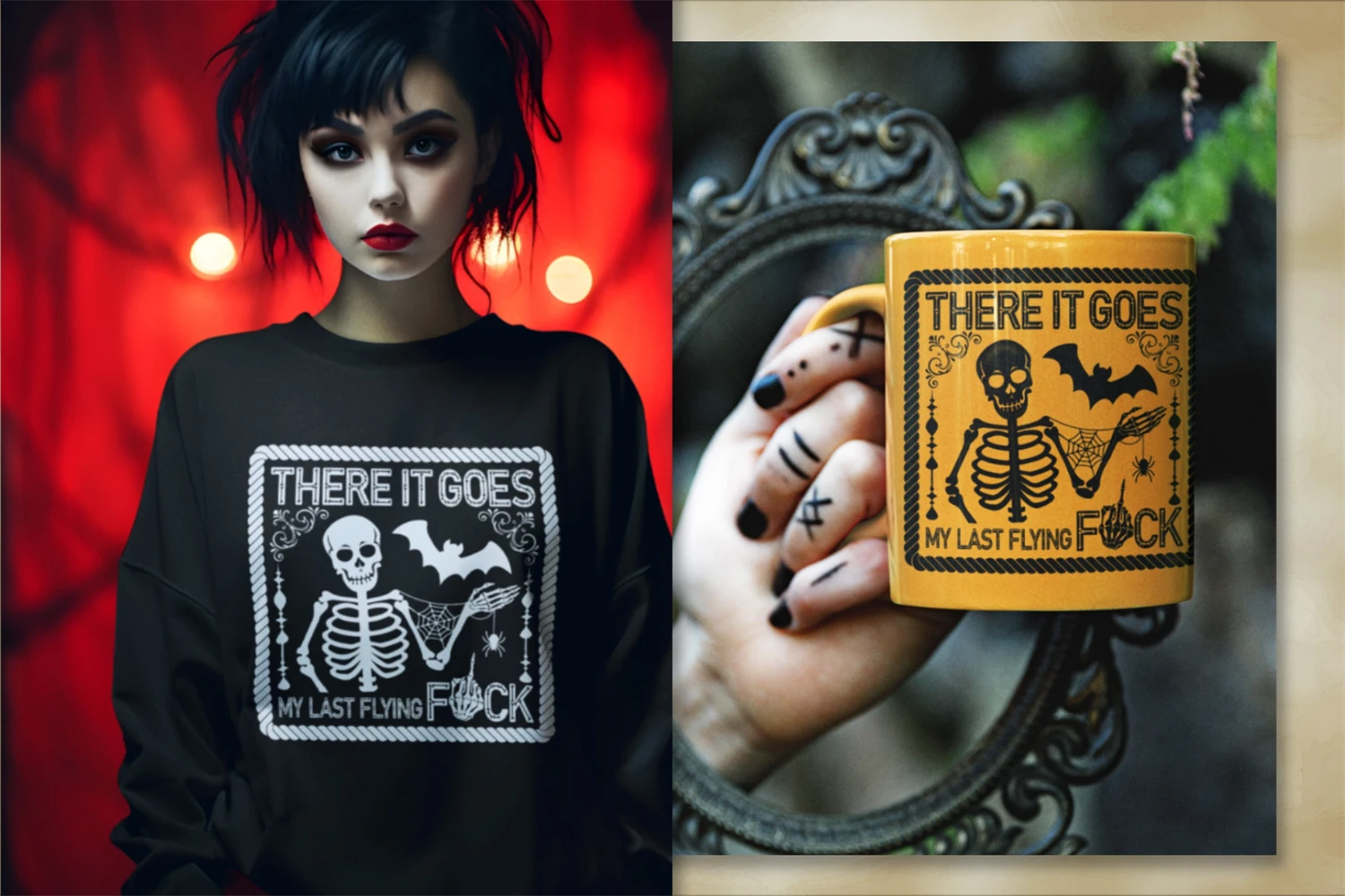 Halloween Skull There It Goes My Last Flying Fck Clipart T-shirt Design for Creative DIY Projects Vinyl Cut Files, and POD projects. There are 2 versions of the design, a simple silhouette version, and a grunge stencil version.