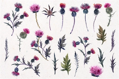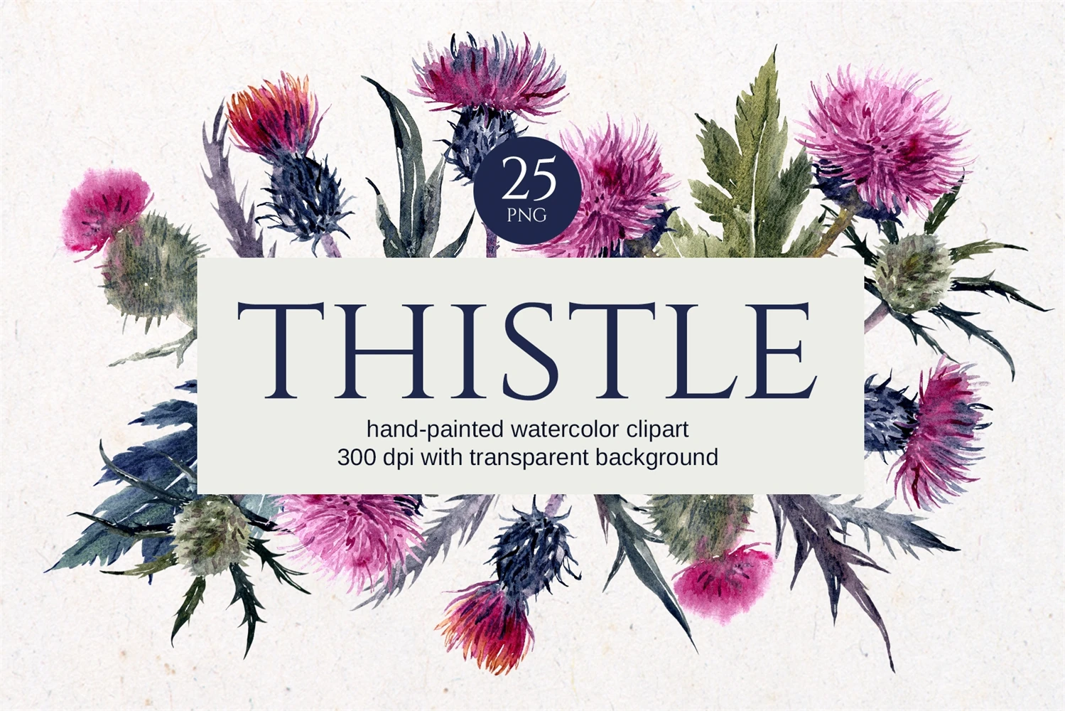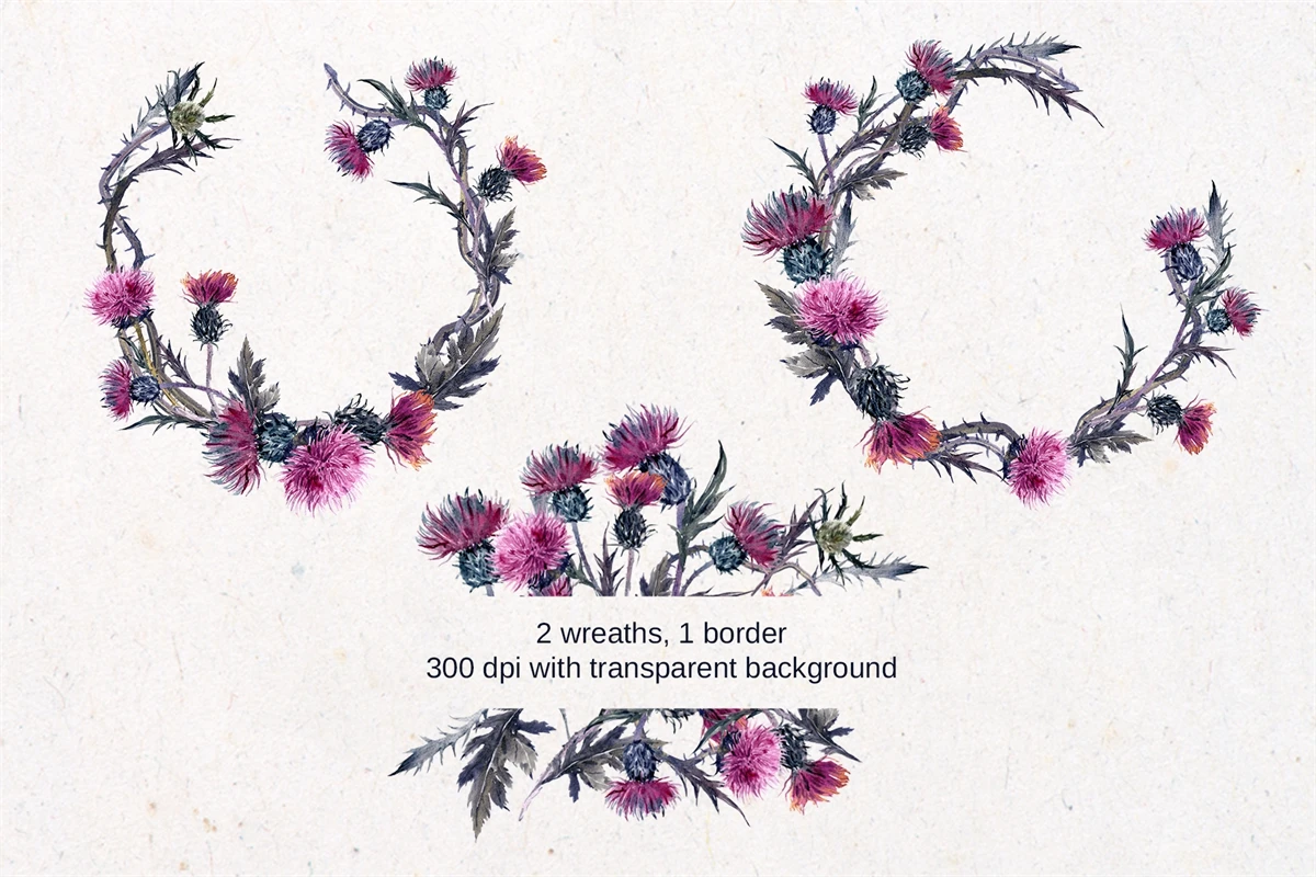 This is a collection of watercolor Thistle flowers, leaves, frame, wreaths. For Halloween, Wedding, Birthday, fabric, digital paper, packaging, invitations and more. You can create many unique items with these illustrations, combine them to create a new one, you will get your amazing design postcards, invitation, packaging, textile prints, merchandise designs and much more. Each element on an individual png with transparent background.