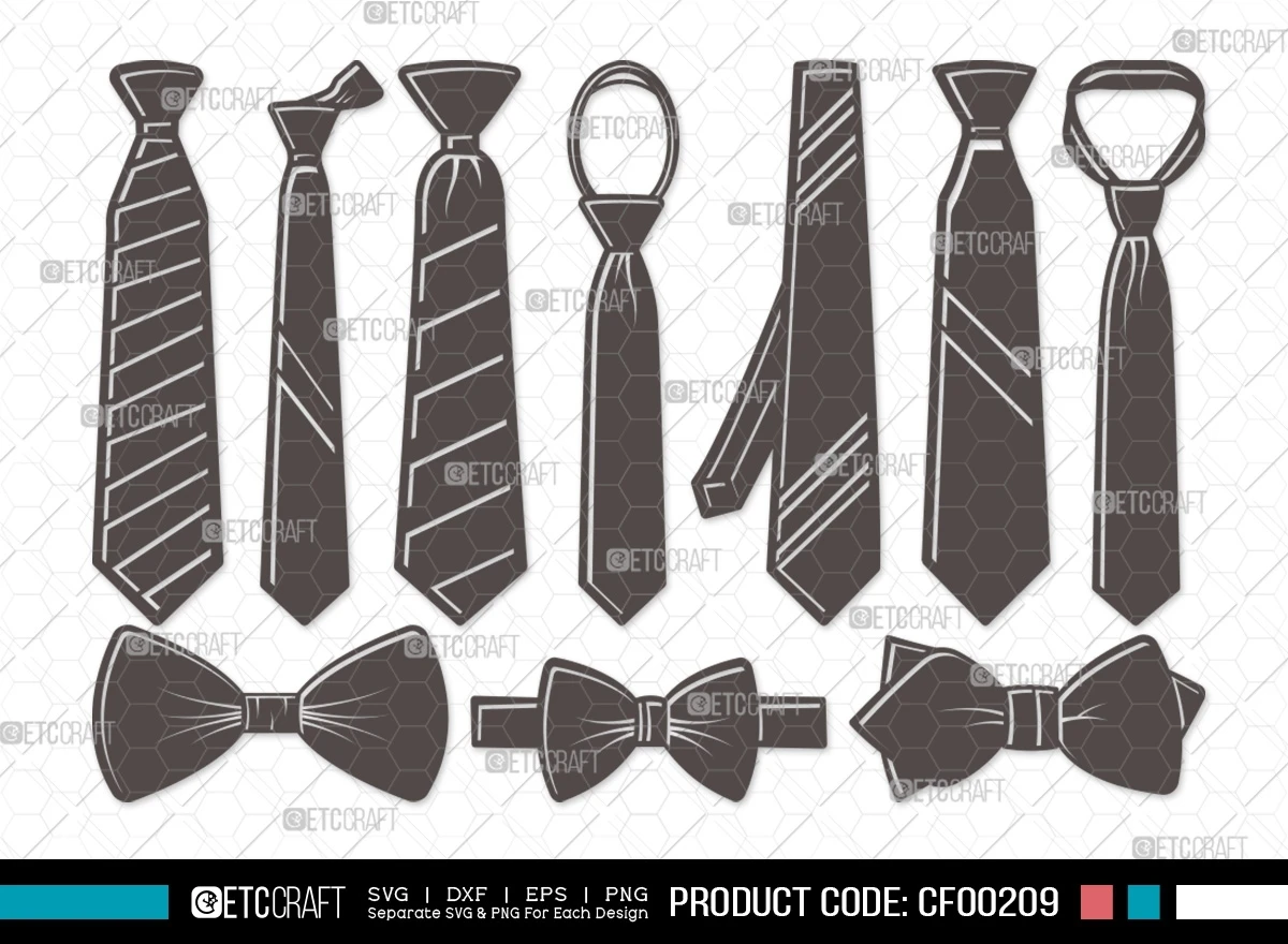Don't miss the opportunity to add a unique, versatile, and high-quality collection of necktie-inspired designs to your creative repertoire. Acquire our Tie Silhouette Men's Wedding Tuxedo Suit Neckties SVG Cut File Bundle now and take your fashion, formal, and design projects to the next level!