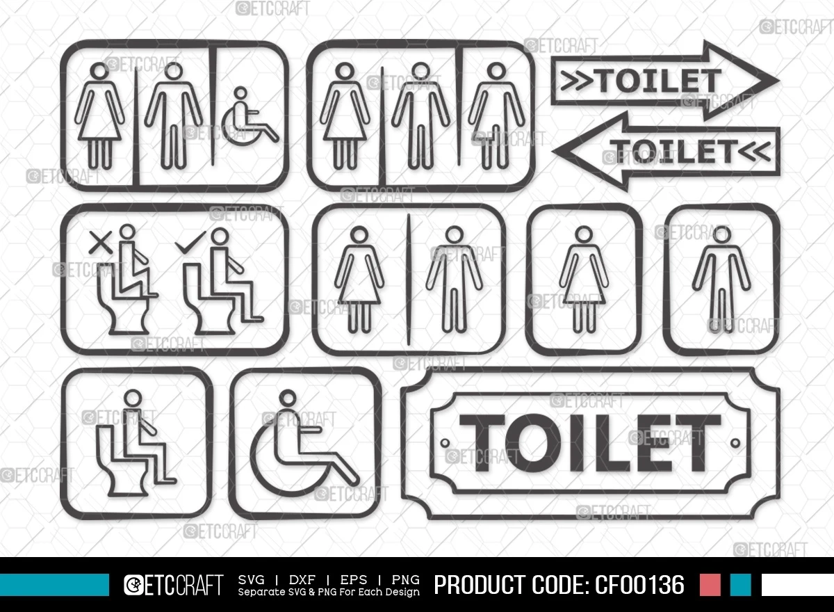 Upgrade your restroom or bathroom decor with our Toilet Sign Outline Bathroom-Restroom Door Sticker SVG Cut File Bundle. This collection offers a range of outline clipart designs perfect for adding a stylish and functional touch to your restroom or bathroom doors. Whether you're a business owner, a homeowner, or a DIY enthusiast, this bundle provides the ideal elements to enhance your space with simplicity and clarity.