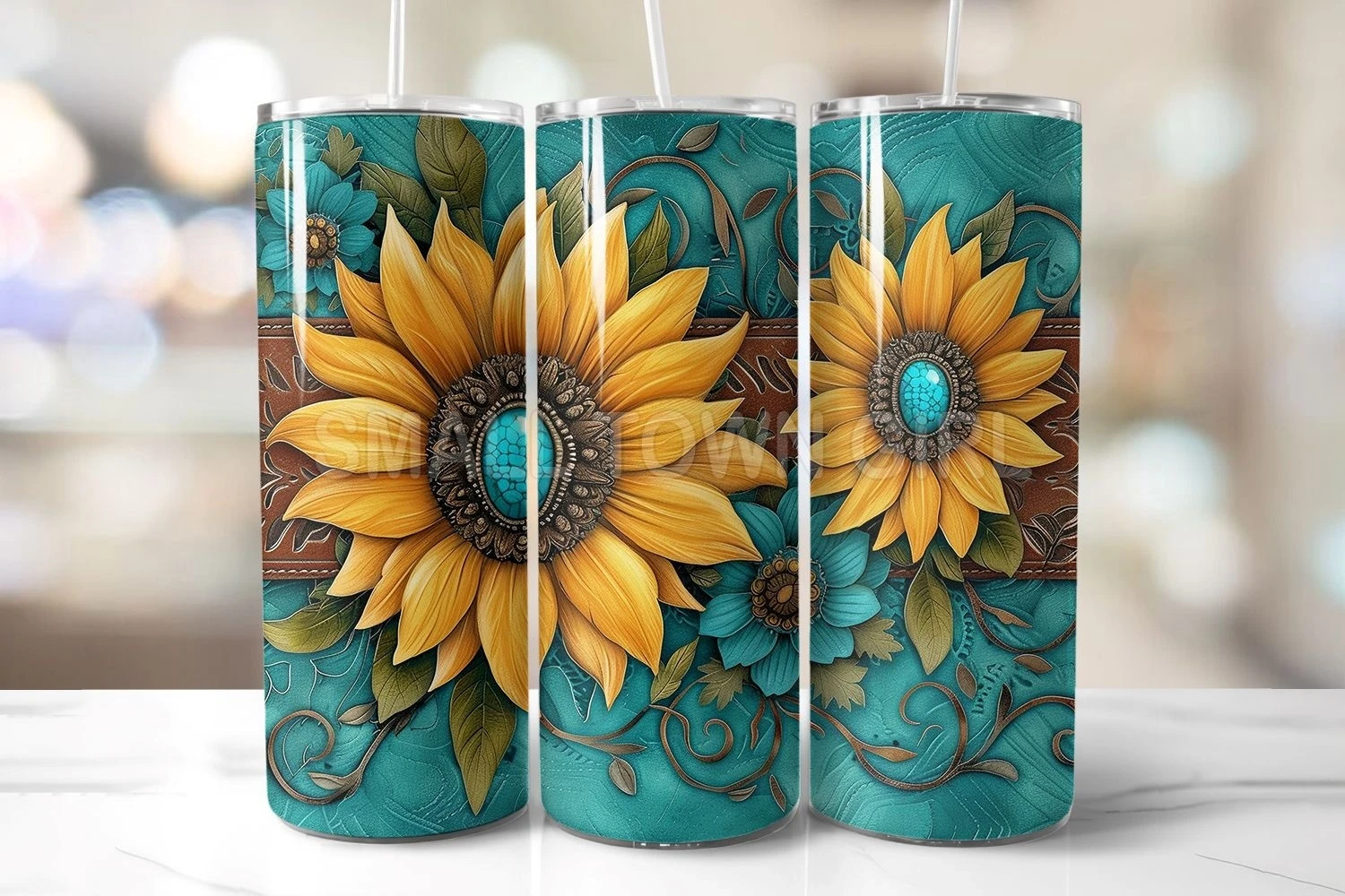 Tooled Leather Sunflower Tumbler Png, Western Tumbler Png 12