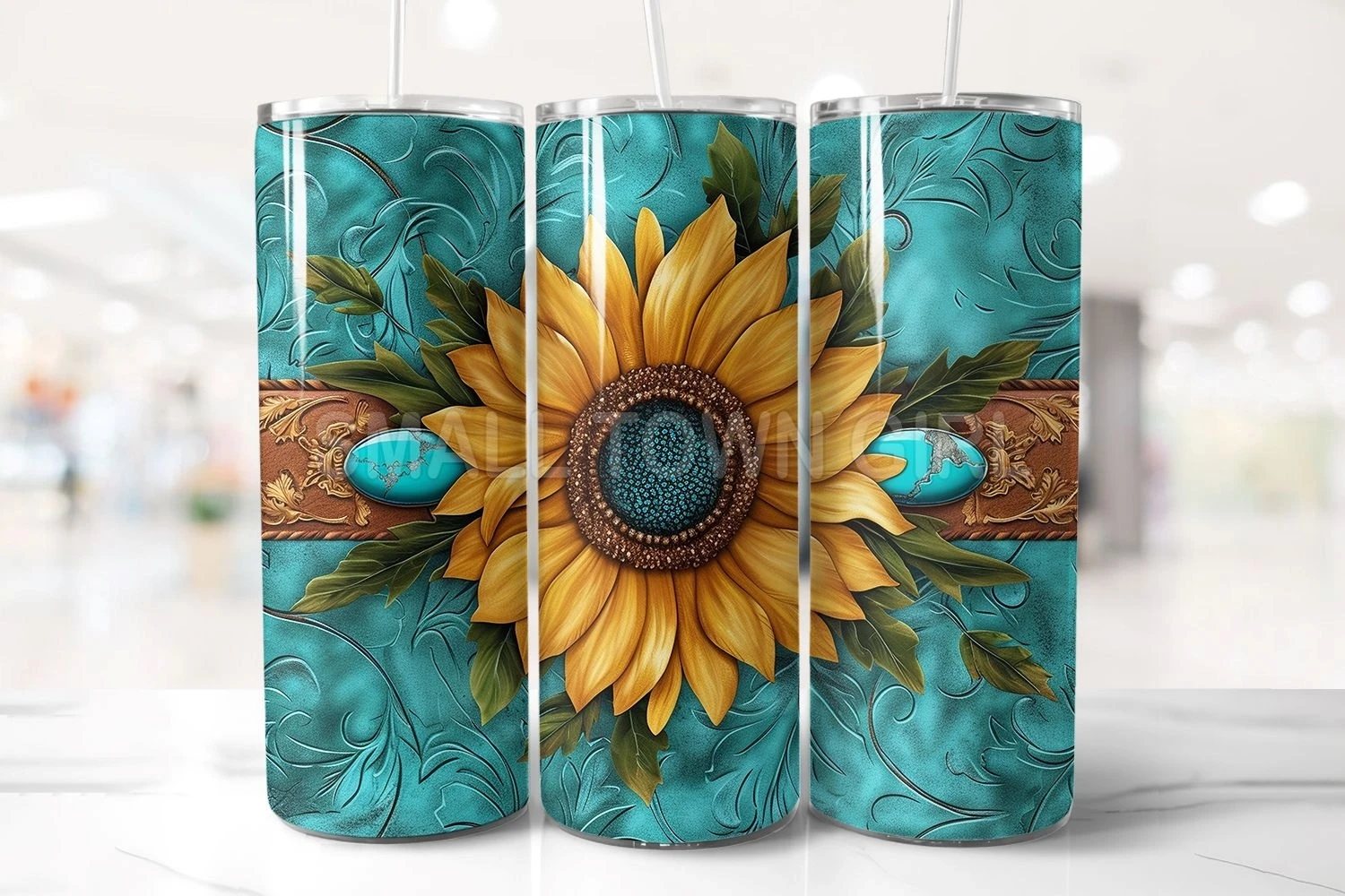 Tooled Leather Sunflower Tumbler Png, Western Tumbler Png 3