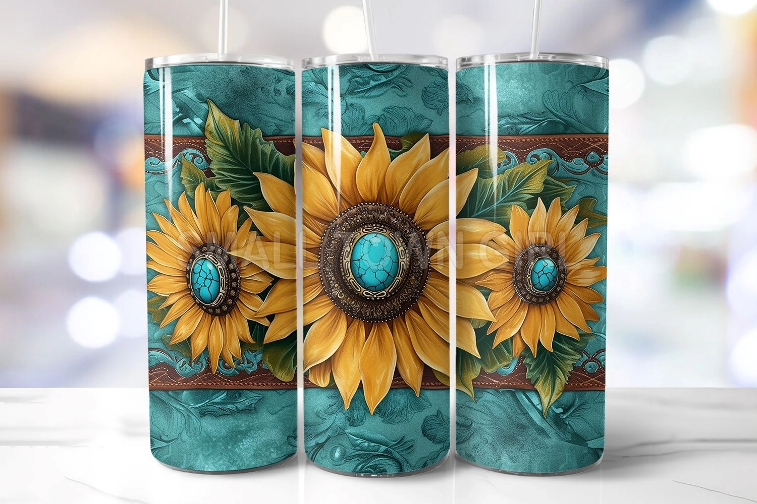 Tooled Leather Sunflower Tumbler Png, Western Tumbler Png 4