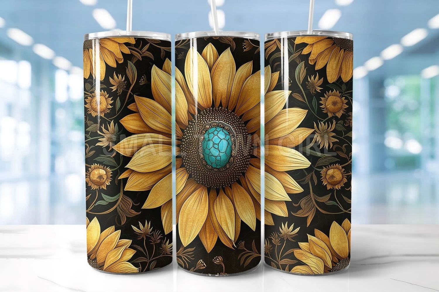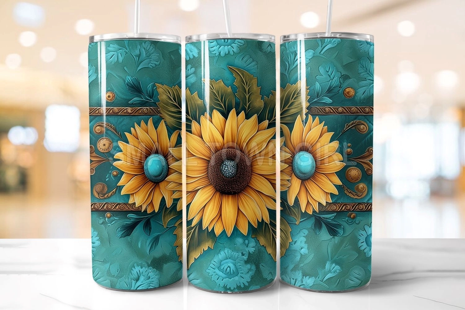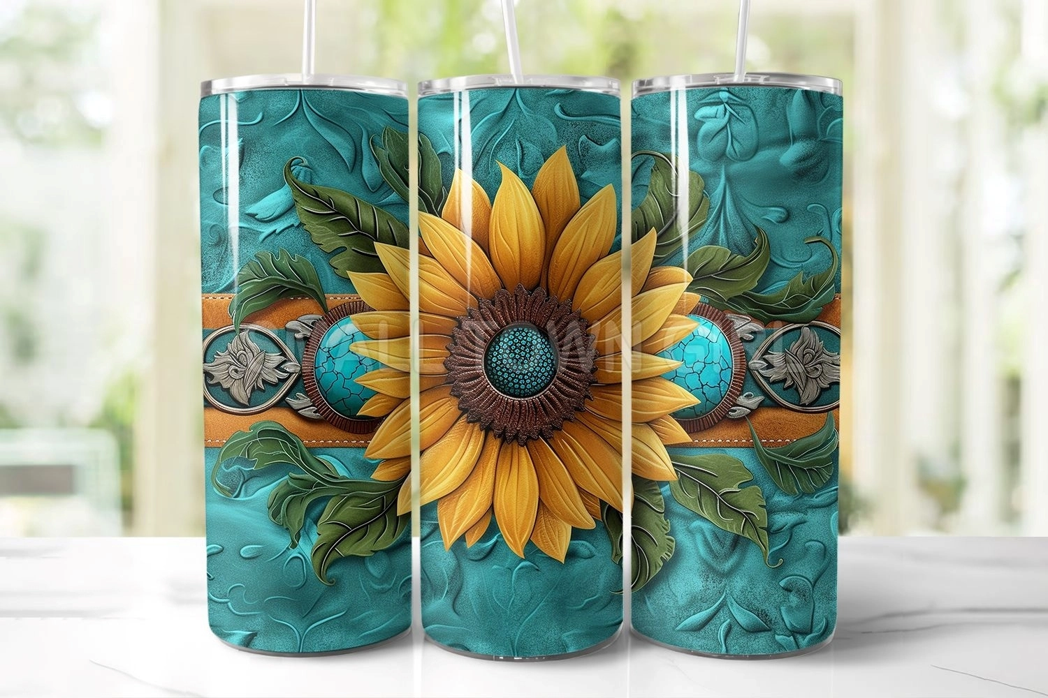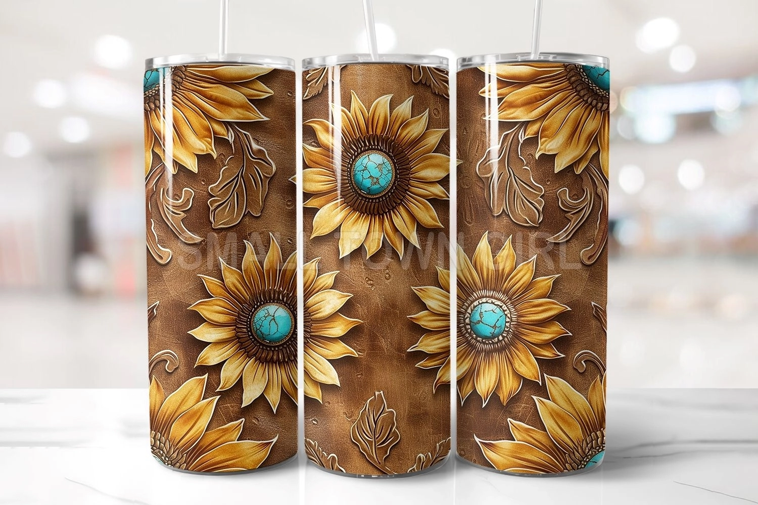 Tooled Leather Sunflower Tumbler Png, Western Tumbler Png 9