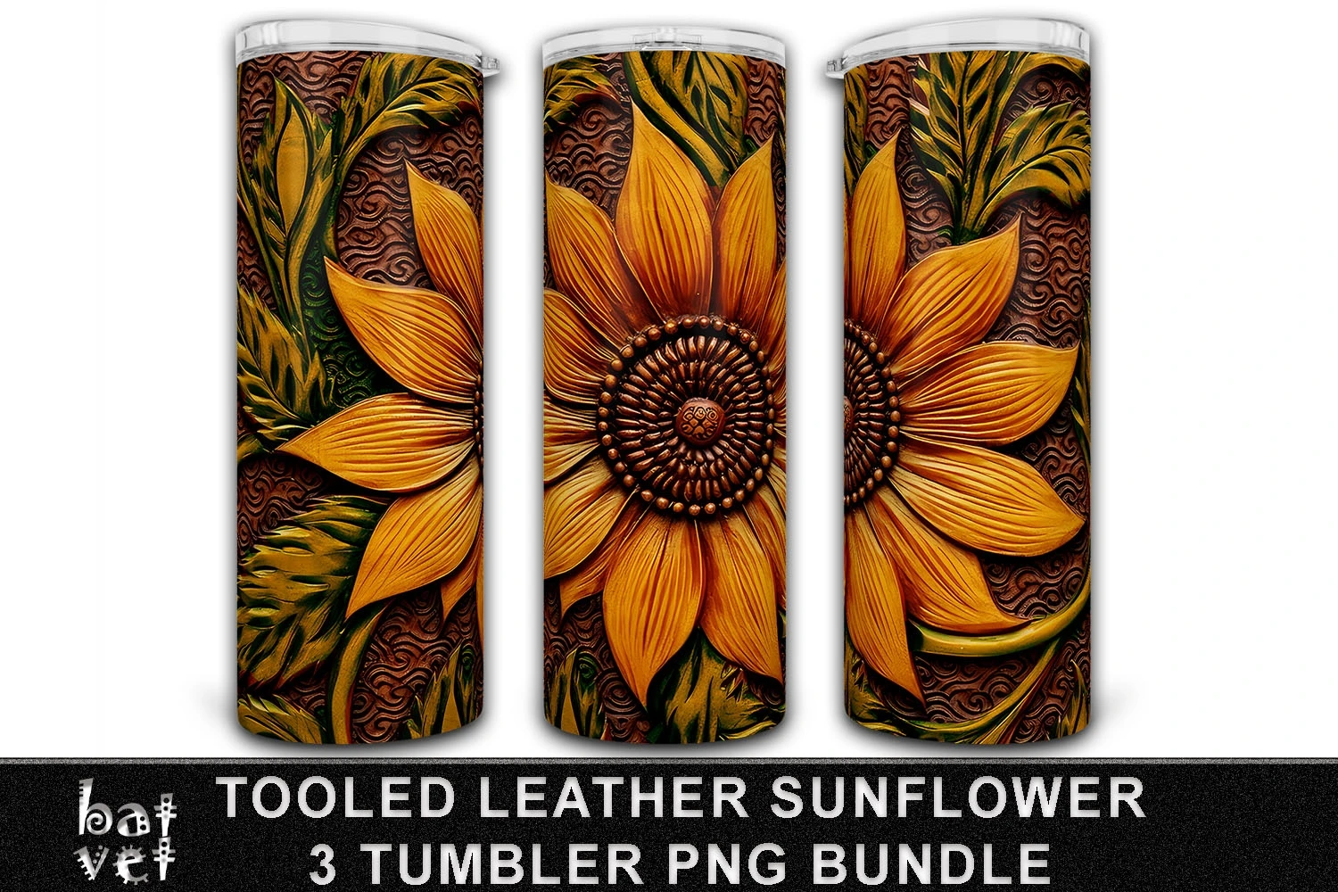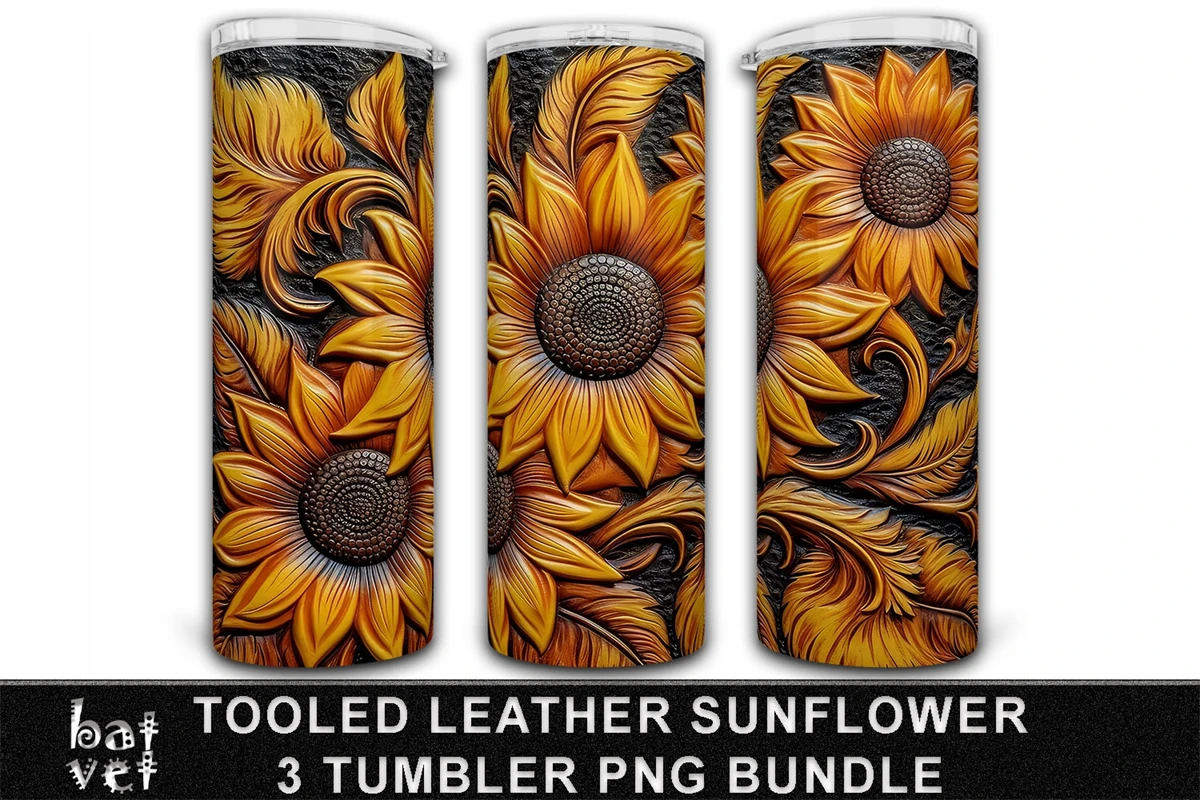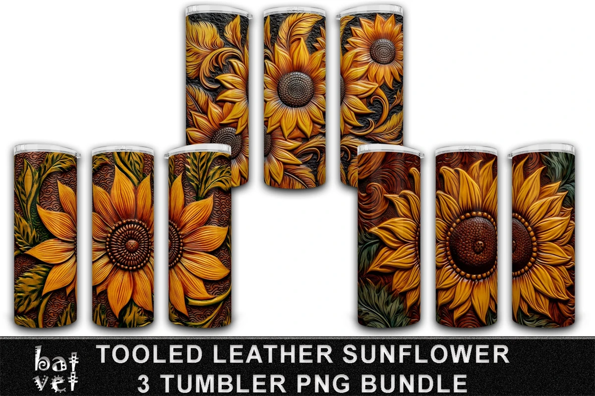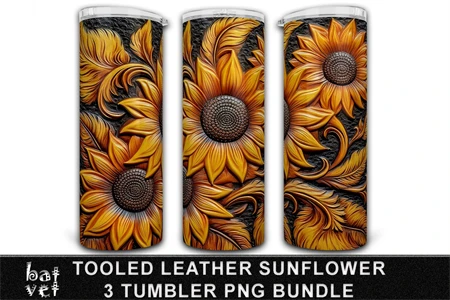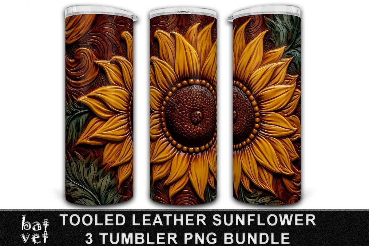 3 Tooled Leather Sunflower Tumbler Sublimation PNG Bundle