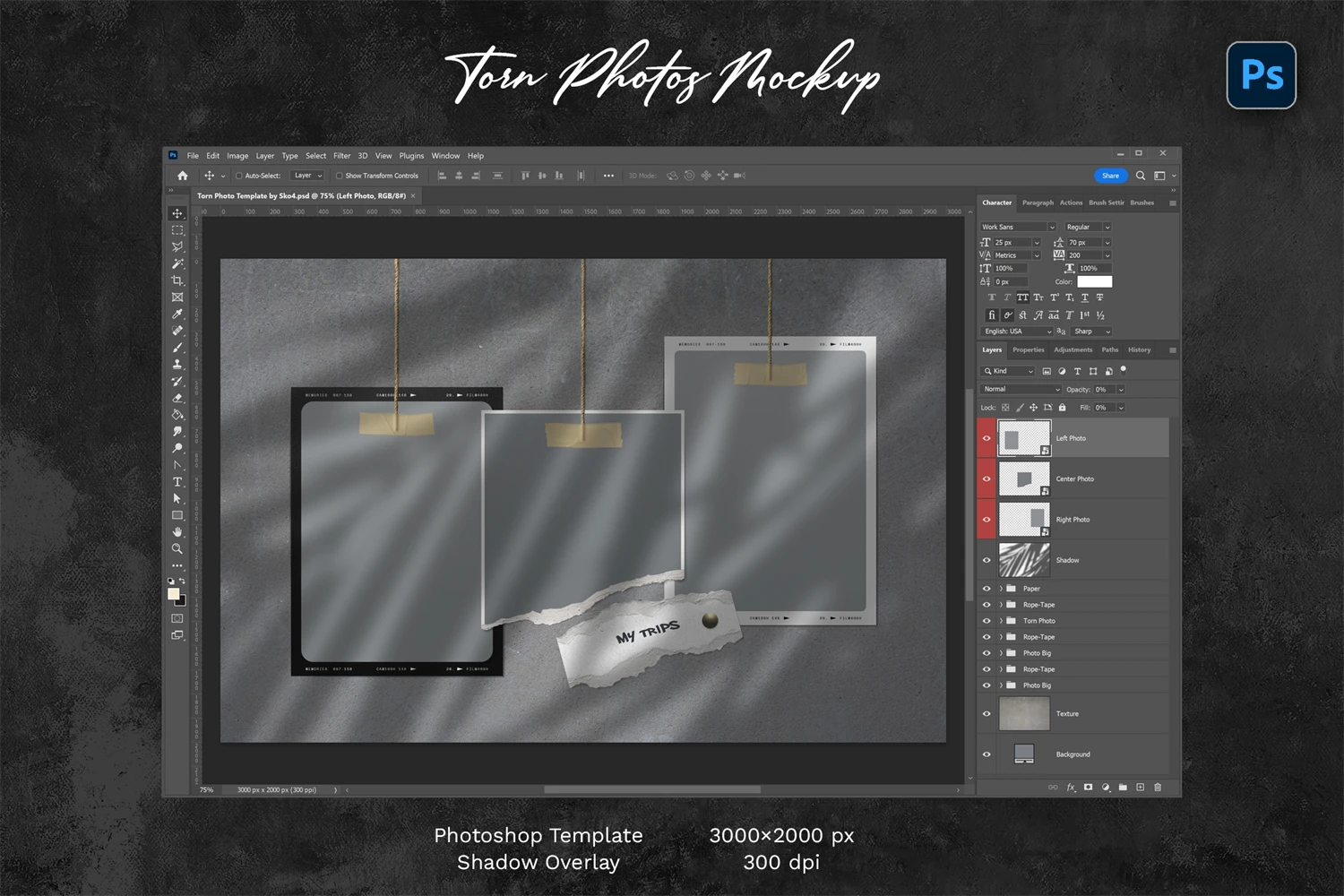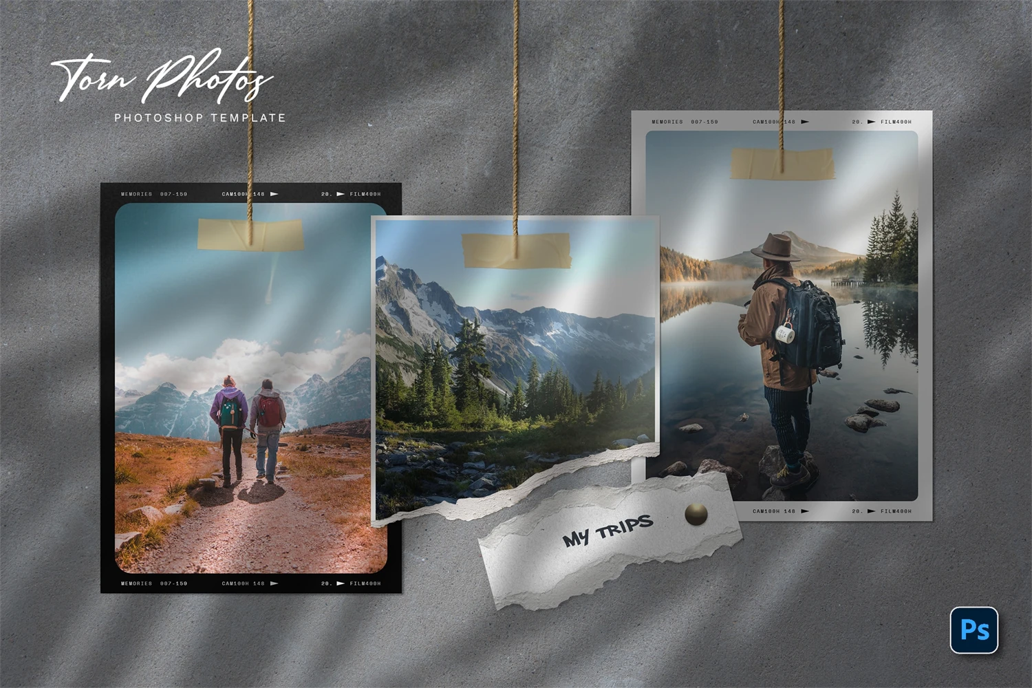 Torn photo edges, ripped edges and realistic natural shadows. Polaroid photos hanging on threads.