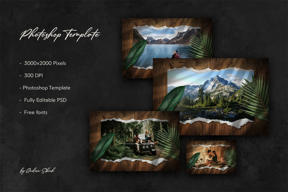 It's easy to use your photos. Just put photo into smart object. All text are editable, free fonts.
