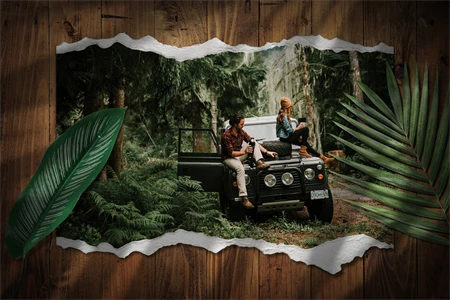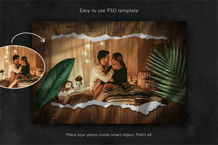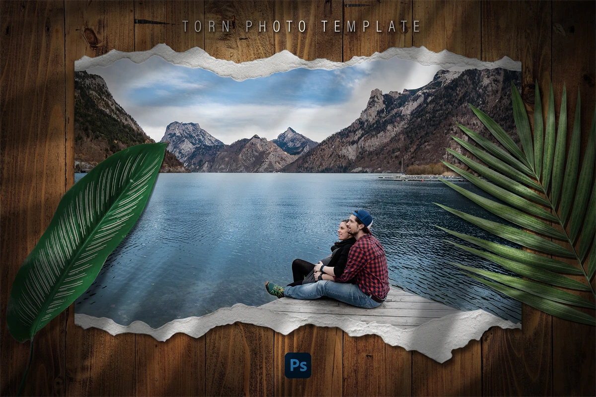 Torn photo edges, ripped edges, palm leaves, realistic natural shadows, real window shadows.