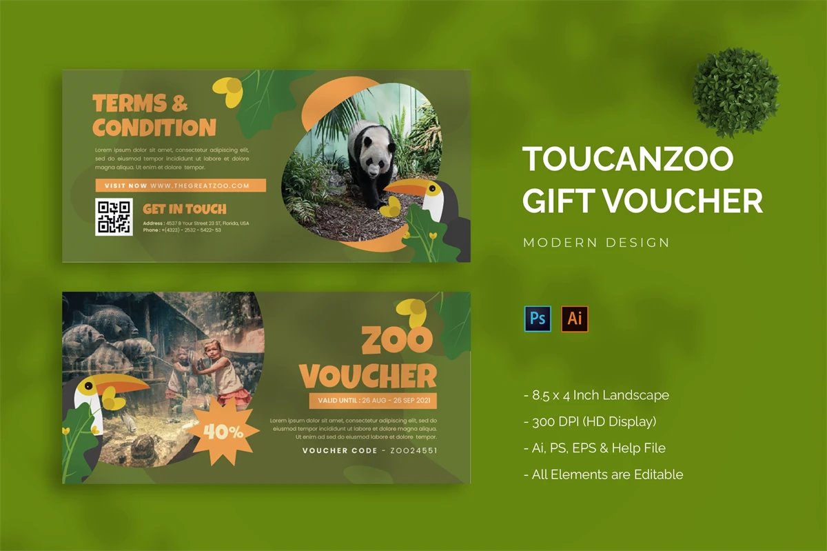This is a ** Toucanzoo - Gift Voucher ** Get it now and don't miss it!, a Gift Voucher for all your business and personal needs. Great for your business and this design will keep you interested, elegant, and easy to edit according to your needs (** Adobe Illustrator, Adobe Photoshop **). You can use this Gift Voucher for your business, event or other publishing like marketing promotions and company profile, and you can also use this gift voucher to your clients and family, I hope you enjoy this, Hope you like it don't forget to rate, Thanks.