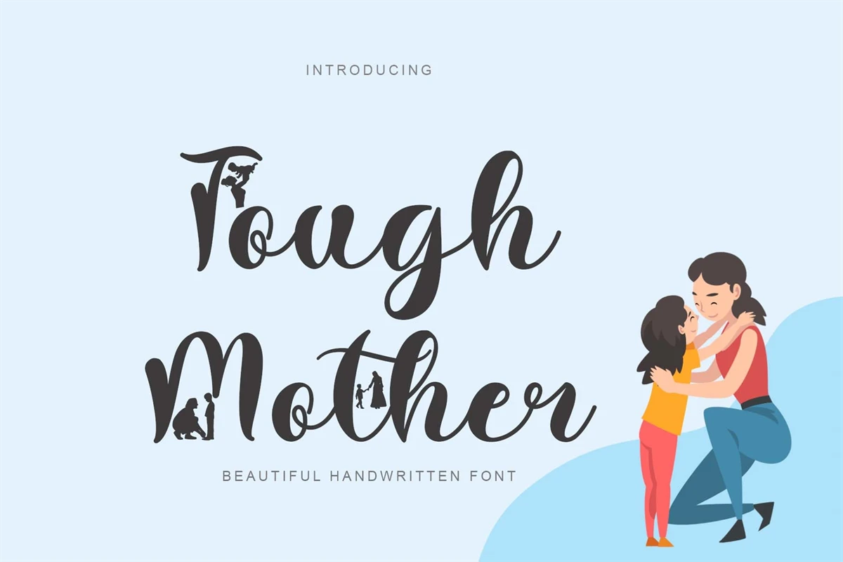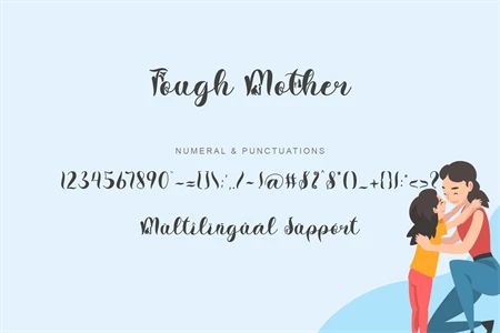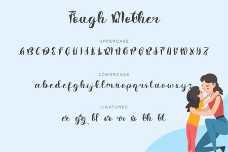 "Tough Mother" is a very unique handwritten font decorated with a mother and her child. This font is very rare and unique. Equipped with uppercase letters, lowercase letters, numerals, punctuation, ligatures, and multilingual support. Very suitable for Easter, spring, Mother's Day, international women's day, and others, Christmas, and others.