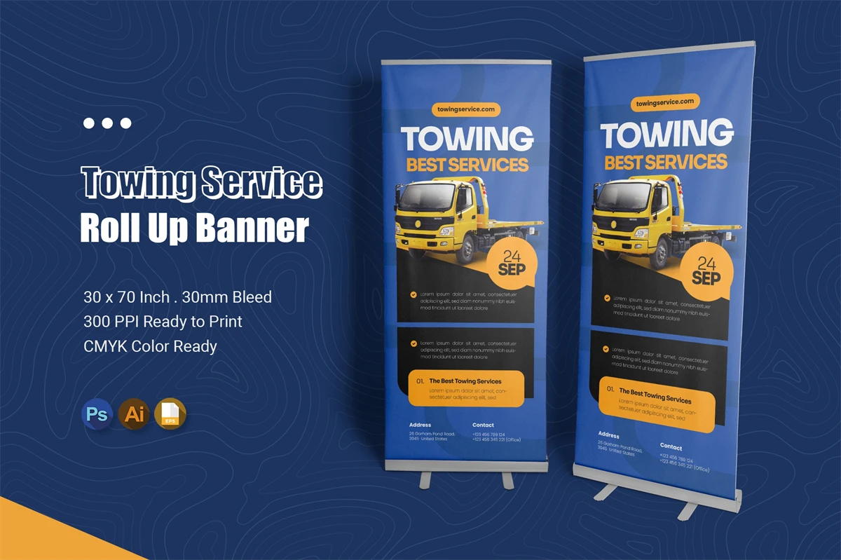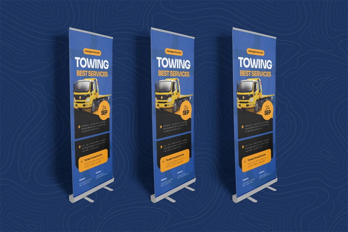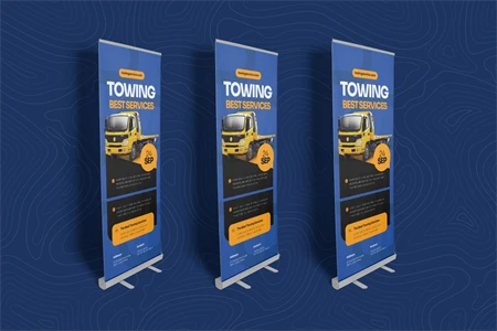 Our roll-up banner template tells your brand's story at a glance. This design stands out and can be used to showcase pictures and content effectively.