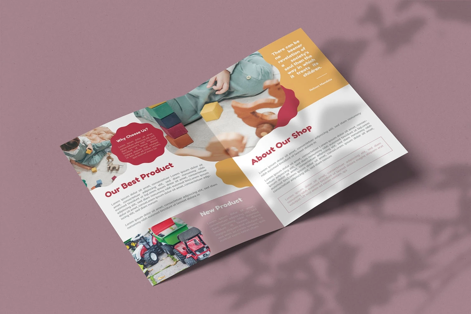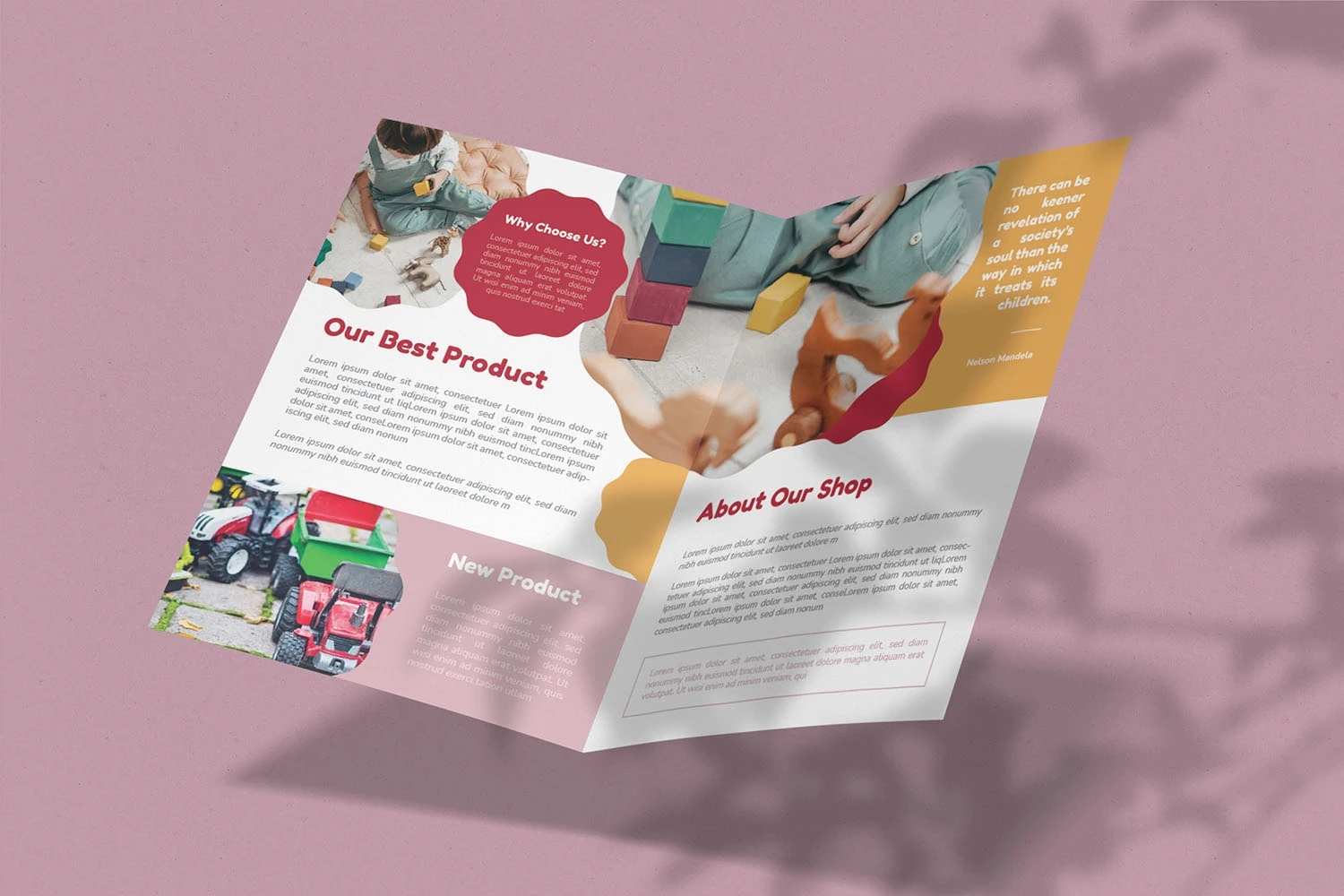 Toys Shop - Bifold Brochure We present this Bifold Brochure for you, simple and very elegant, and this Bifold Brochure is suitable for all types of your business, made with Adobe InDesign (INDD), Adobe Photoshop (PSD) and Adobe Illustrator (AI), very easy to customize, Hope you Like it, dont forget to rate, Thanks.