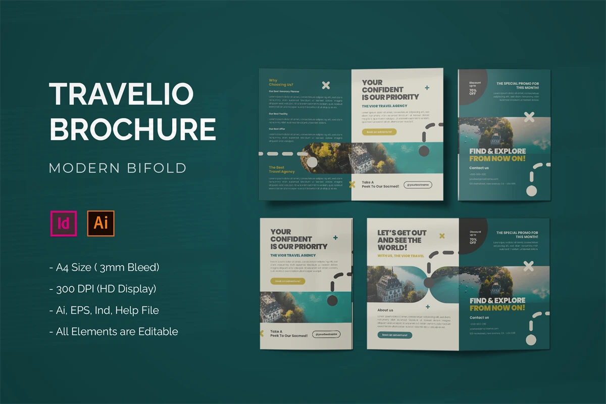 Travelio Blue - Bifold Brochure Here is a bifold brochure we created for you. It's basic yet sophisticated, making it ideal for promoting any of your business's services or products. It is very easy to customize. I hope you like it; don't forget to rate it, thank you.