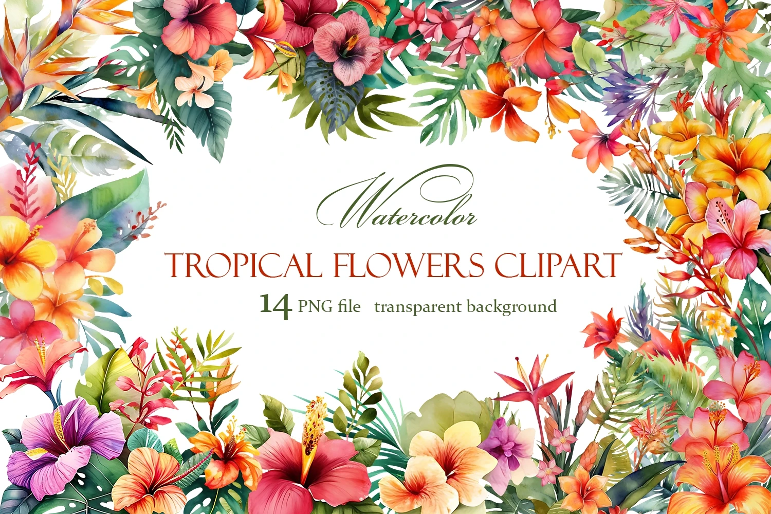 Colorful and exotic watercolor collection with Orchids, palms and tropical flowers. Super elegant with earthy greens.