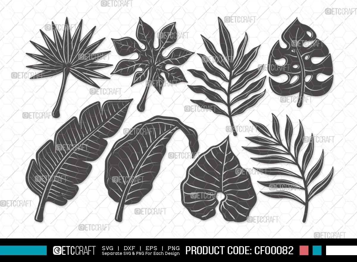 Discover the beauty of tropical flora with our "Tropical Leaf Silhouette Monstera & Palm Leaves SVG Cut File" bundle. This digital collection of meticulously designed silhouettes is your passport to a world of creativity and natural elegance.
