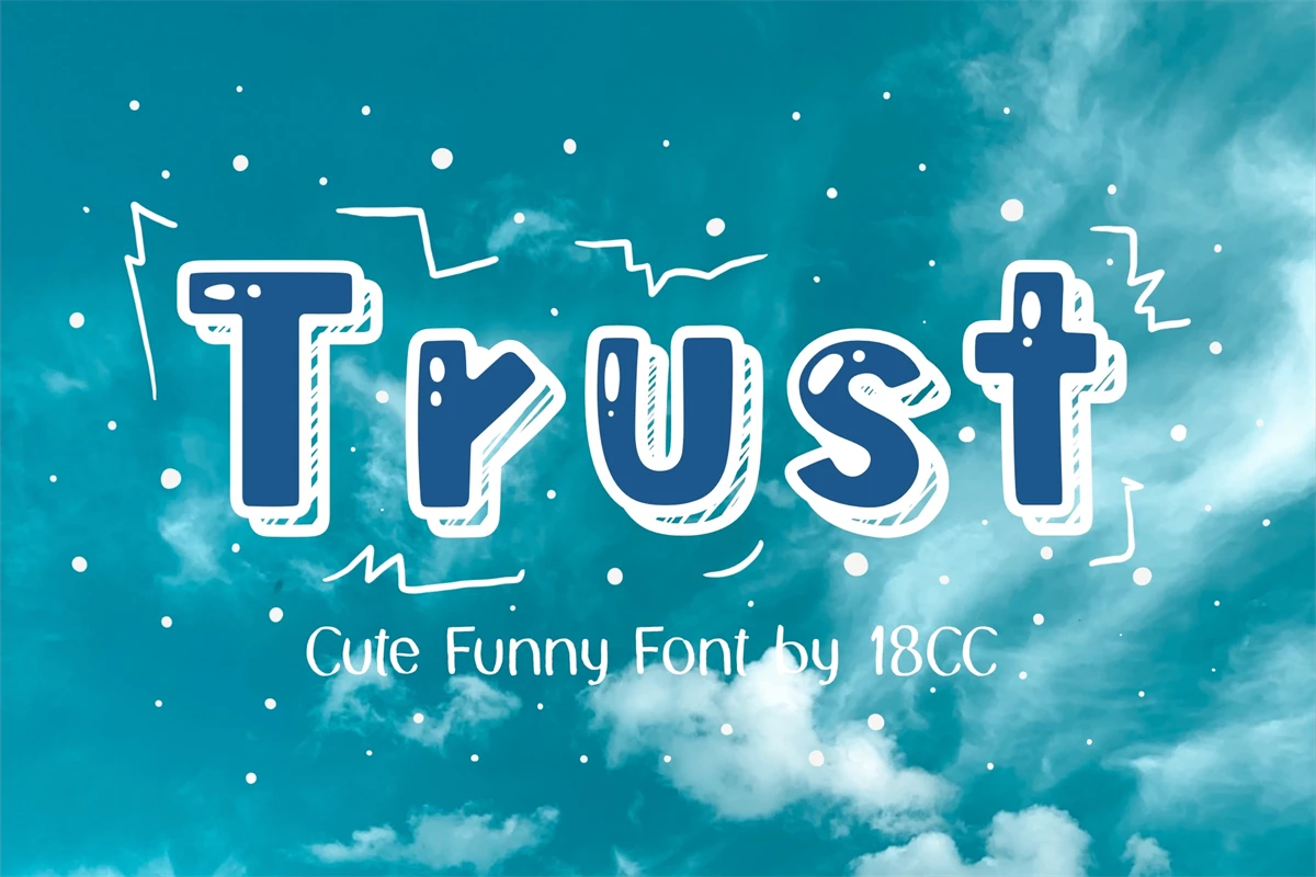 Trust is a cute and funny font. This font is perfect for a design that requires a fun accent. Is suitable for book covers, posters, packaging, merchandise, logotype, and much more.