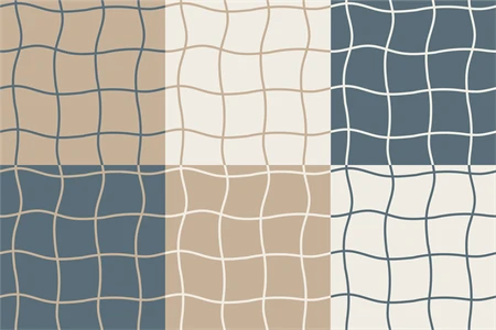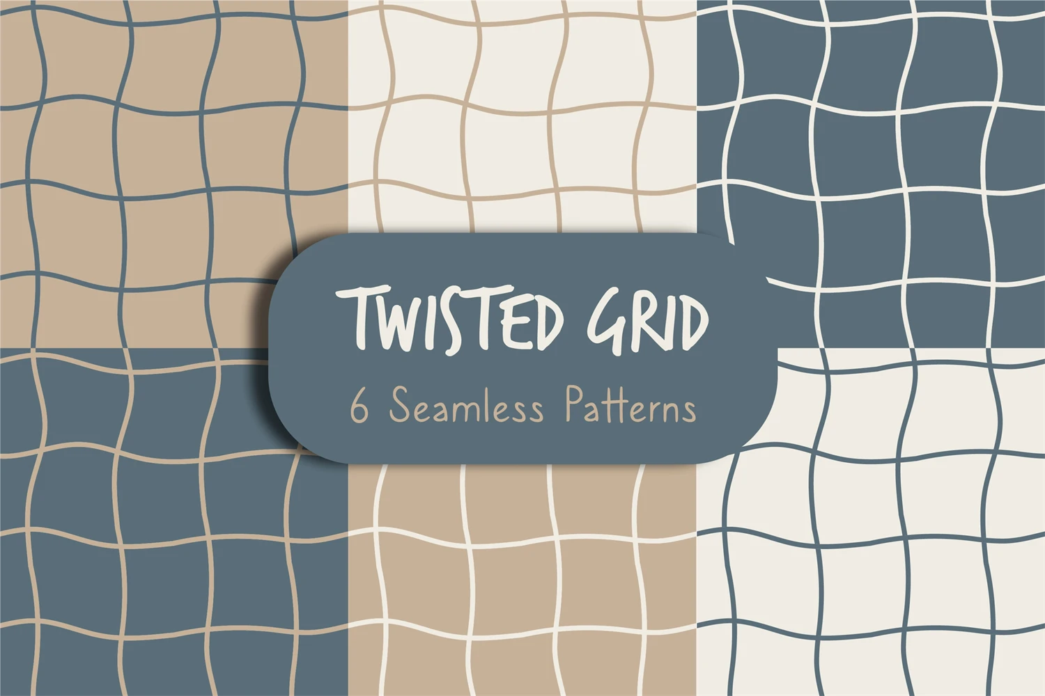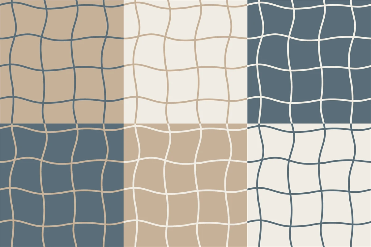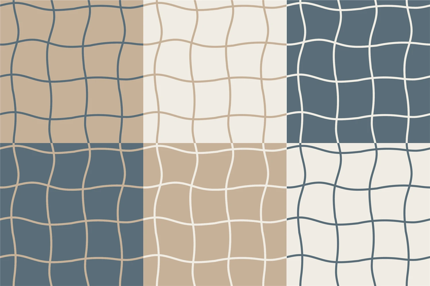 Trendy distorted wavy grid seamless patterns with neutral pastel colors. Modern hand-drawn curvy beige and gray checkered backgrounds and digital papers are perfect for fabric, textile, backdrop, wrapping paper, wallpaper, social media, kids, clothes, etc. Abstract minimal groovy design. Vector illustration.