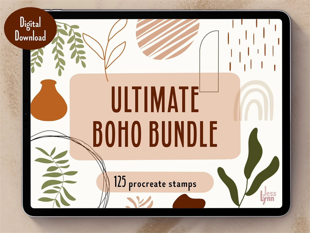 Treat yourself to something special with the Ultimate Boho Bundle! This collection of 125 Procreate stamps features plant and leaf stamps, abstract shapes and decorative boho accents. Plus, you get two bonus color palettes to create beautiful artwork - perfect for bringing some boho vibes to your designs!
