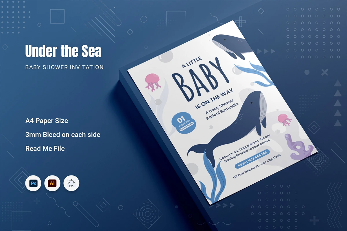 A **Under the Sea Baby Shower Invitation** can be used for your baby shower or baby's birthday. You could also use it as a promotion for baby and parent photography services. Match the needs, whether personal or business. This template is easy to adjust and easy for you to edit according to your taste.