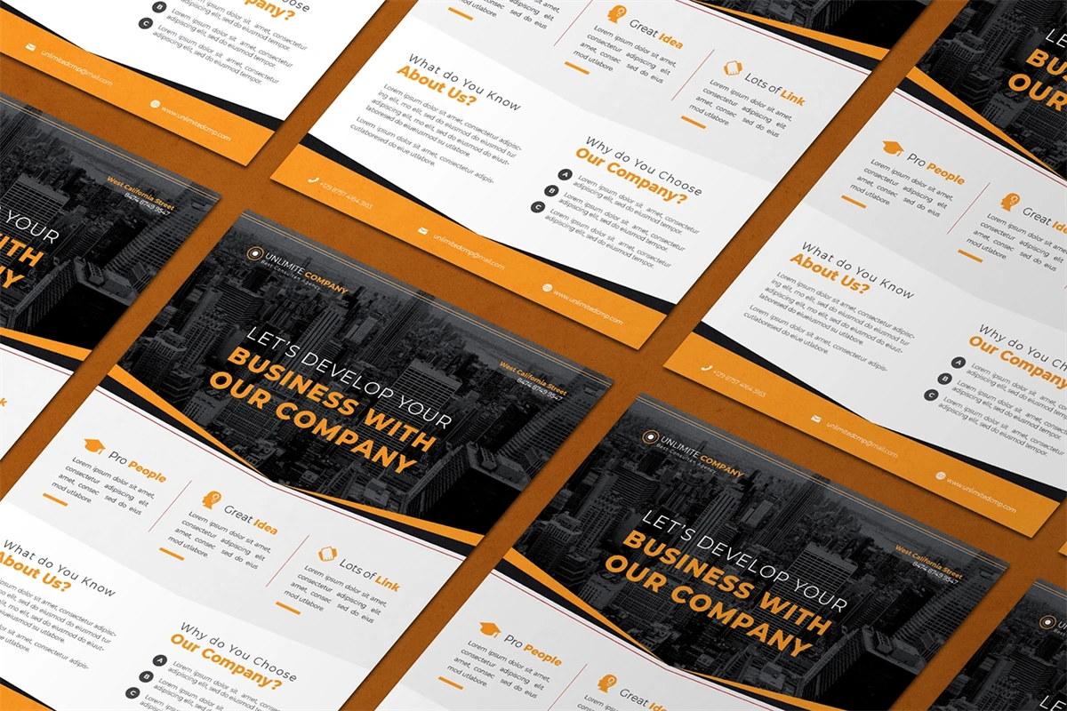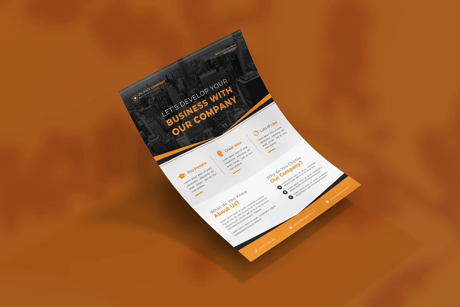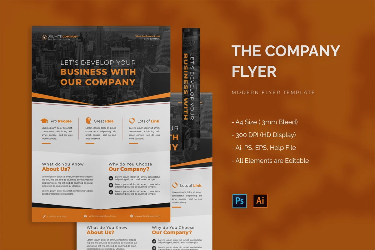 Unlimited Company - Flyer. This Flyer template is designed for your company's business needs. very clean and elegant, and also easily edited and adjusted to your liking