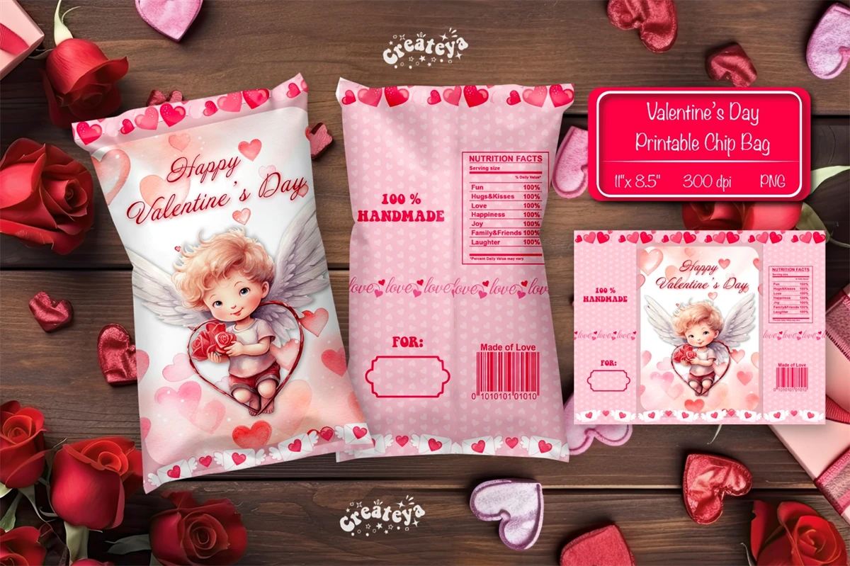 Valentine Chip Bag template for party favors it's 8.511" PNG at 300 DPI. Designed with watercolor Angels. The adorable Angel's Valentine gift design adds love to your celebrations!