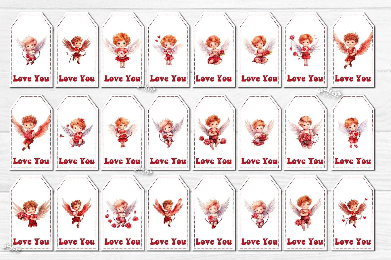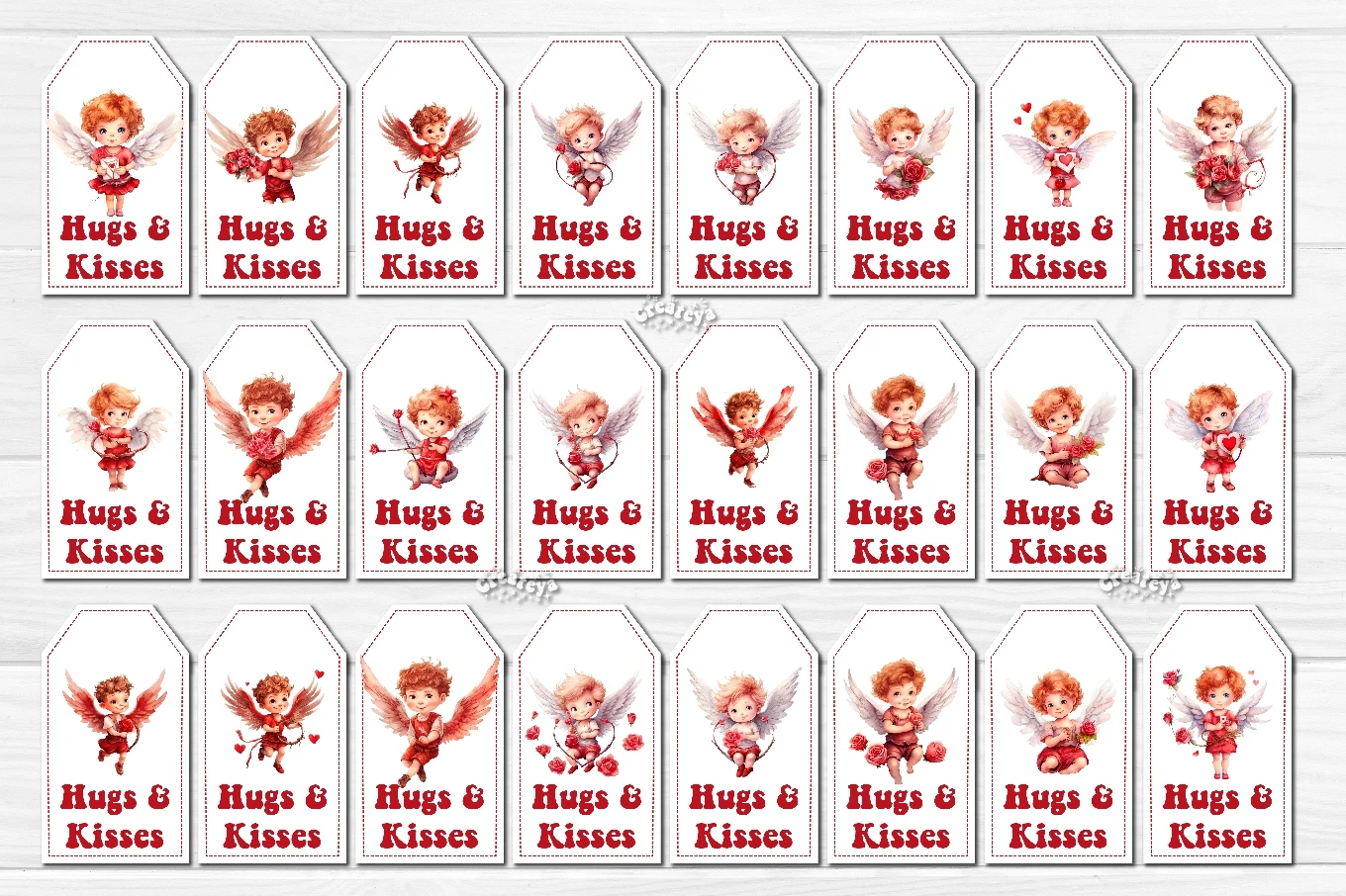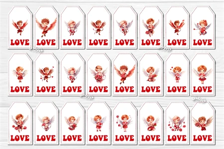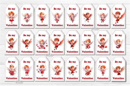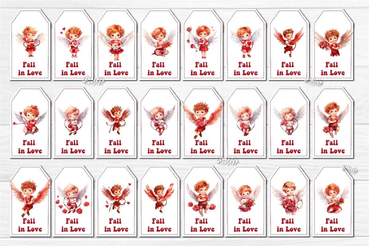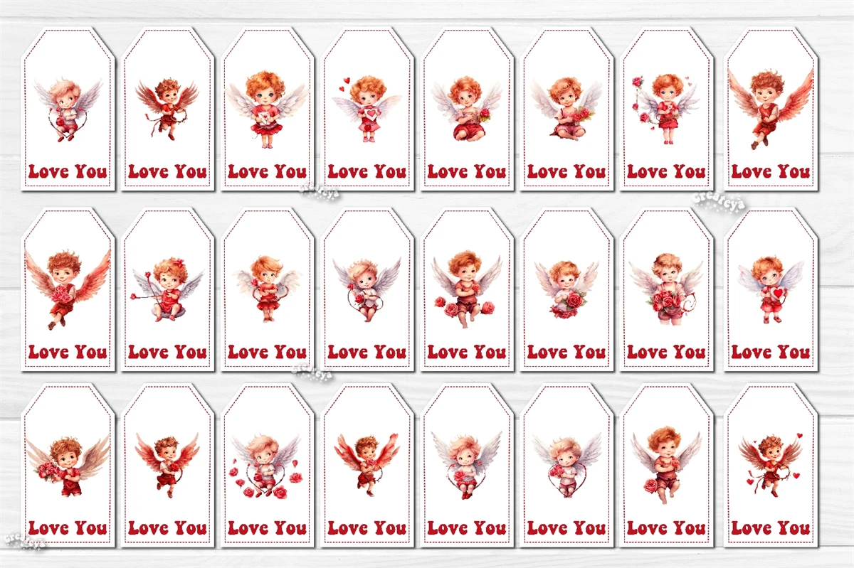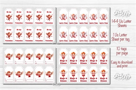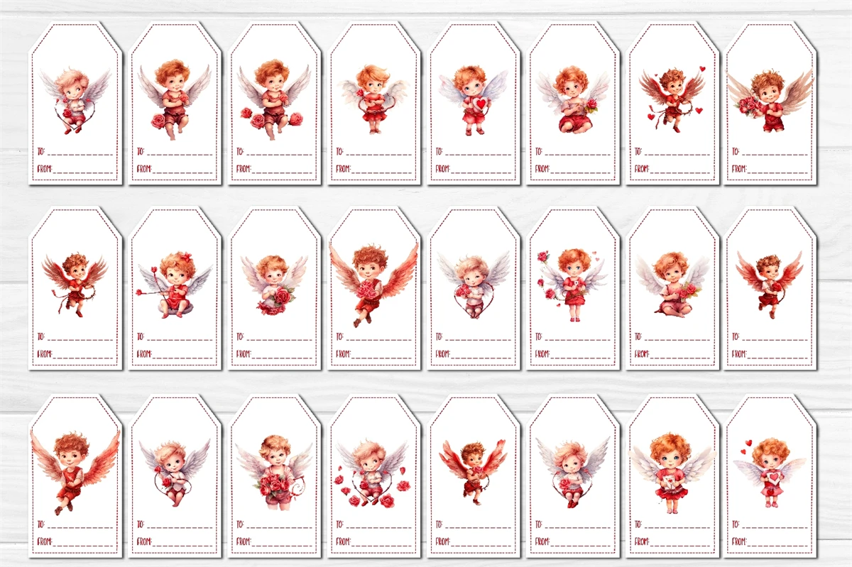 Valentine Gift Tag designs Valentine's day tag printable PNG with watercolor Baby Angels and Boys Cupid Cute Printable Design. The Bundle contains 144 tag designs individually, and 144 sheets with 10 gift tags. Add some warm and romantic to your celebrations with these printable gift tags! Perfect for gifts, favors, and decorations. Easy to use and bursting with style.