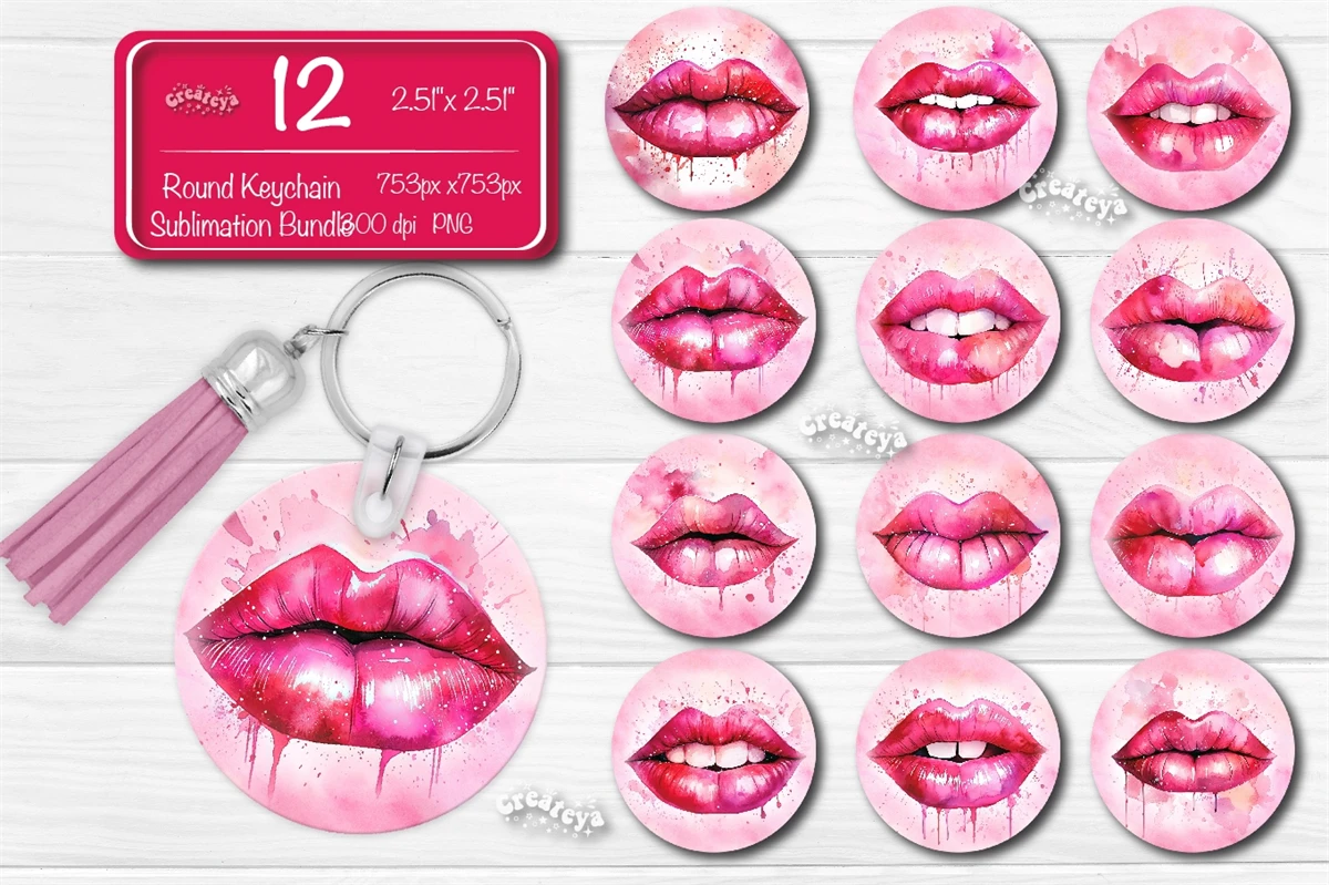 Round keychain sublimation Bundle Valentine keychain contains 12 designs with Watercolor Pink lips PNG. The Valentine Sublimation Round keychain is perfect as a delightful gift. Get your set now and let the cuteness take over!