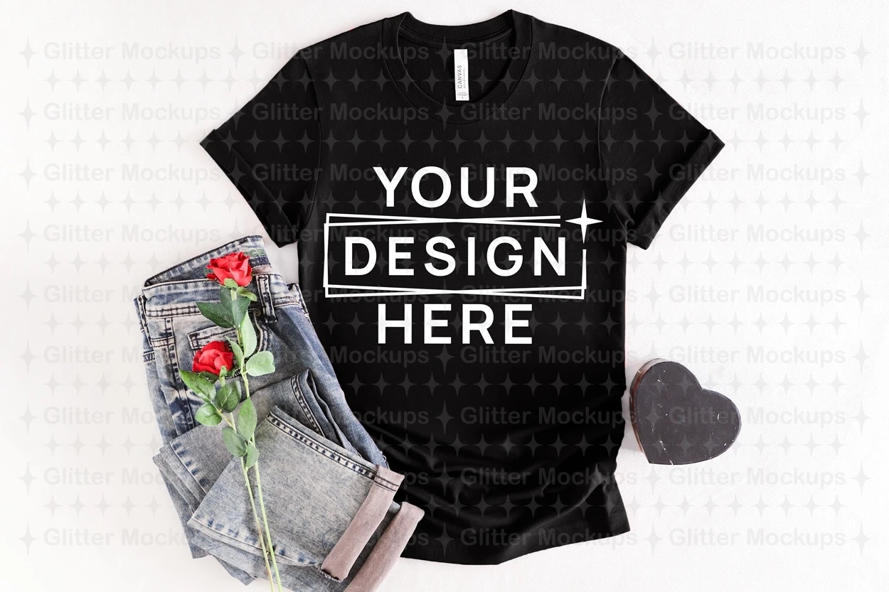 Valentine's Day Black Bella Canvas 3001 Mockup, Flat Lay