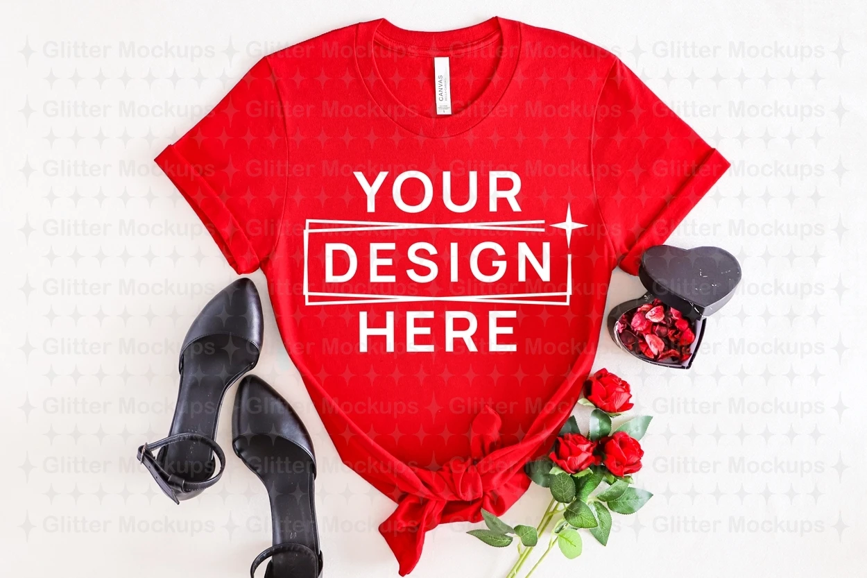 Valentine's Day Red Bella Canvas 3001 Mockup, Flat Lay, Png