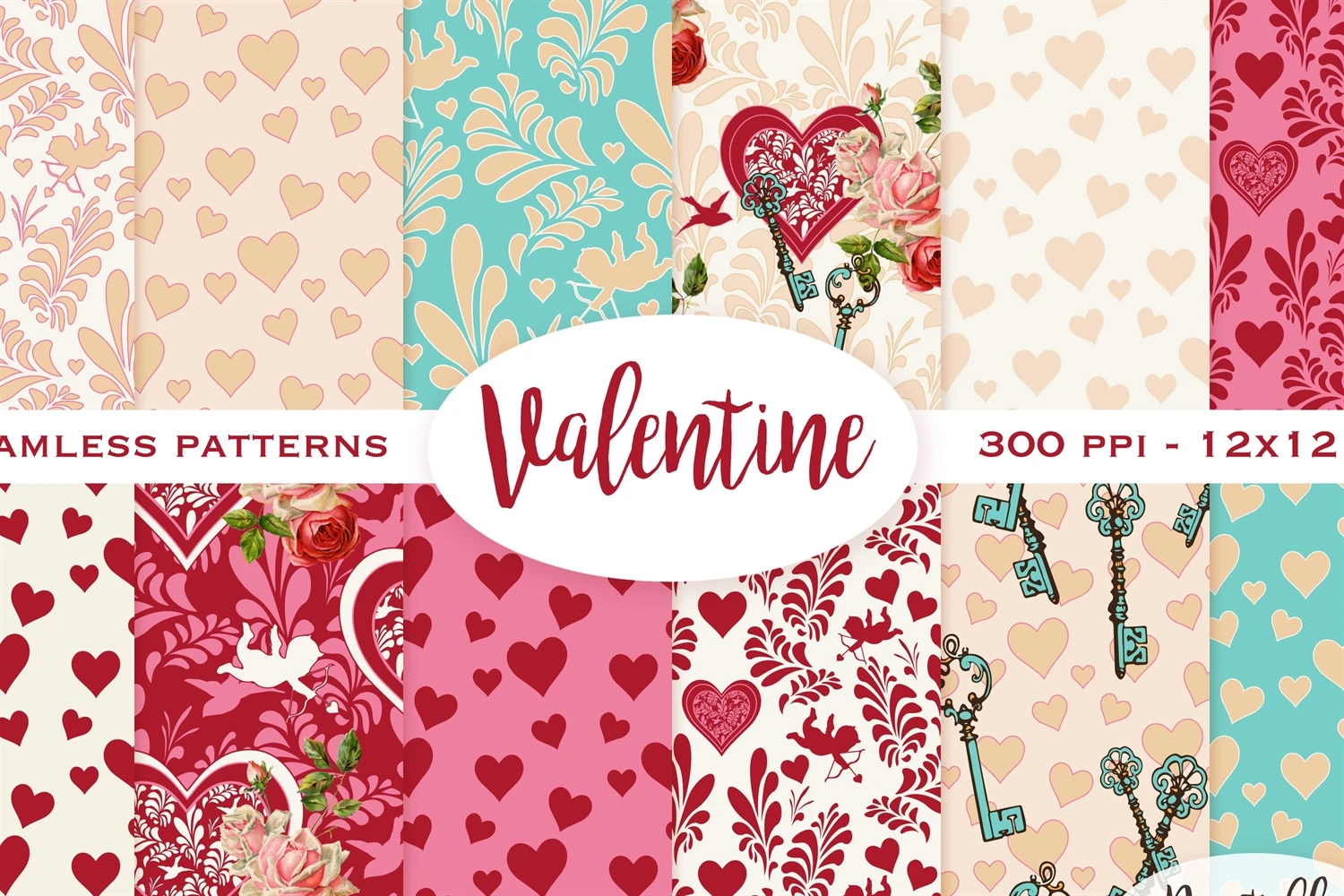 Lovely Valentines Day patterns, all seamless. Full of hearts, cupidos and roses. You can use it for wrapping paper, print it on fabric or decorate cards. Its up to you! Enjoy working with them!