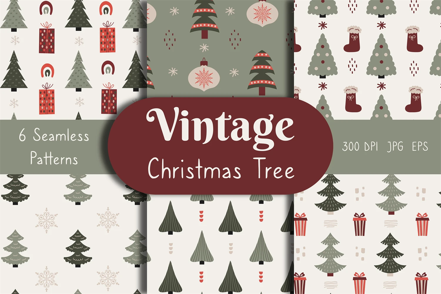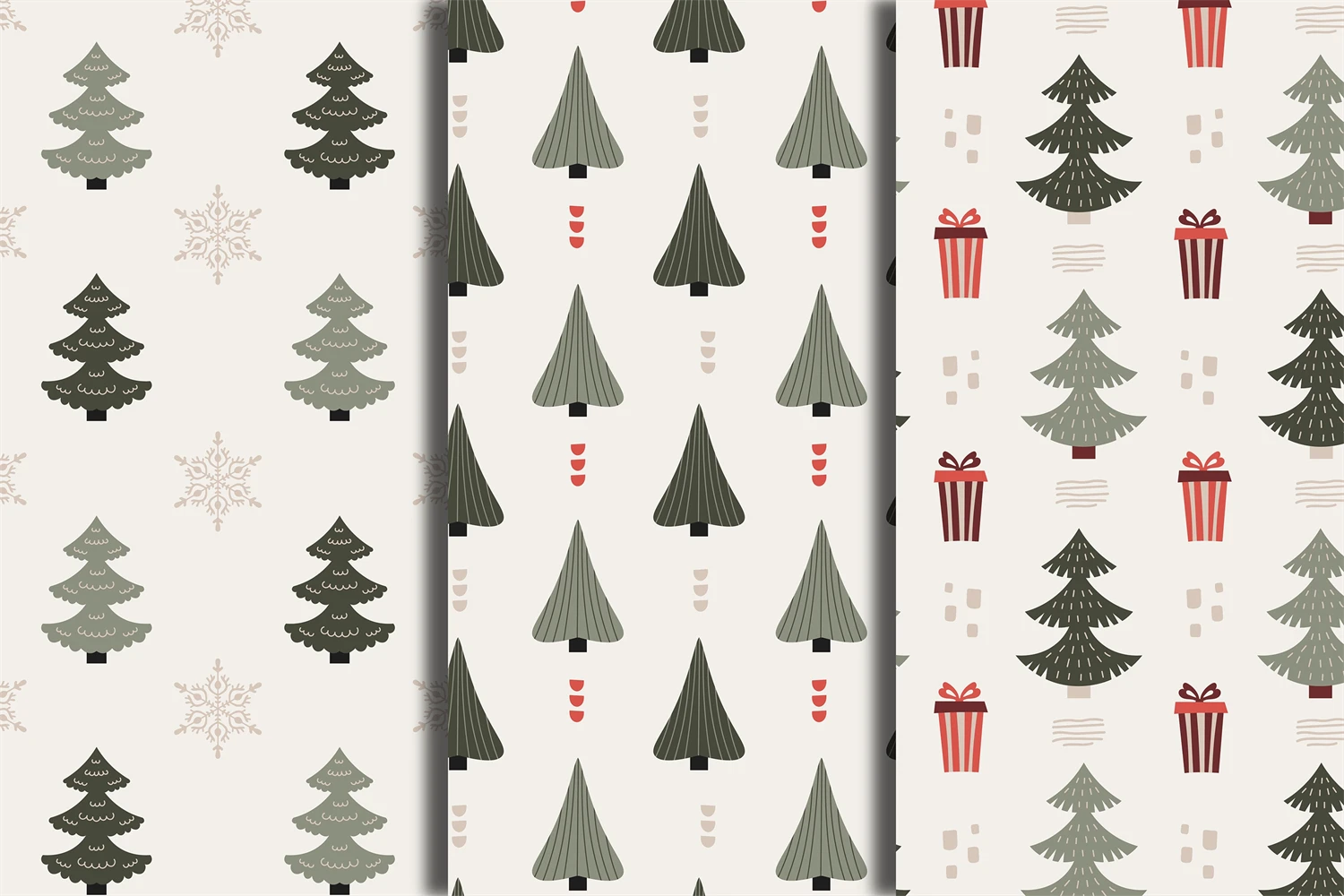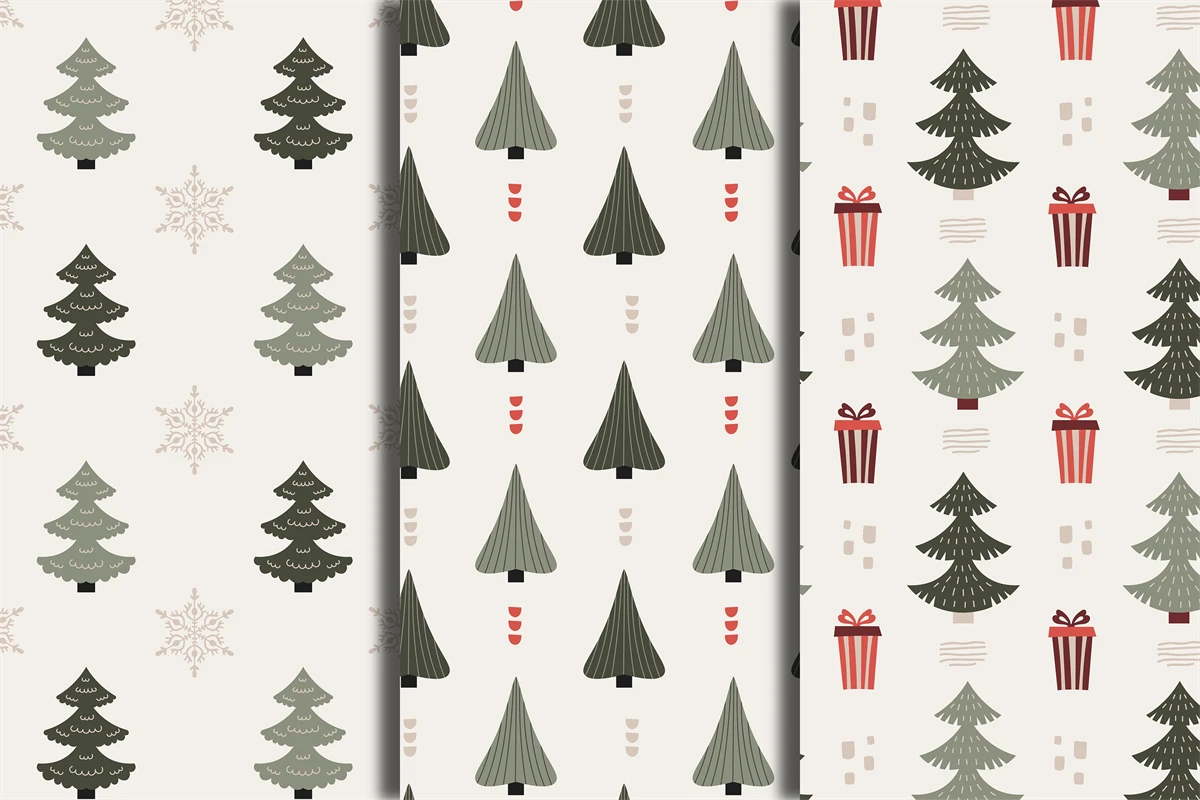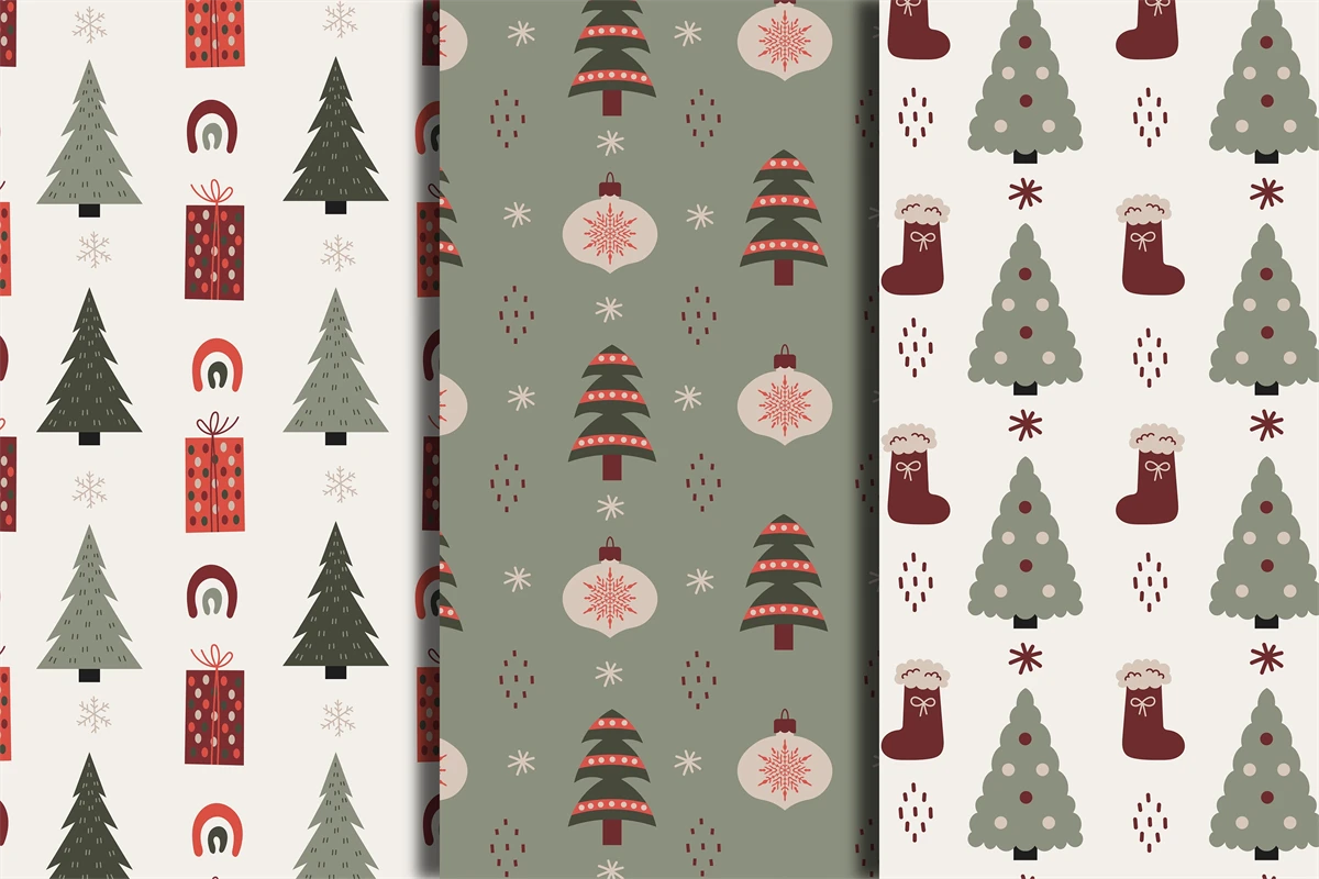 Trendy minimalistic Christmas seamless patterns bundle with Christmas tree, coniferous pine, fir, spruce. Muted colored endless backgrounds with baubles, gift boxes, snowflakes, Christmas stocking, rainbows and abstract organic shapes in modern Scandinavian style. Elegant Xmas ornaments, decorations, digital papers with minimal design are perfect for New Year, wrapping paper, wallpaper, fabric, textile, junkbooking, scrapbooking, decoupage, kids, etc.