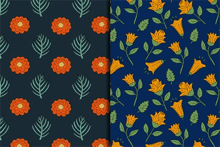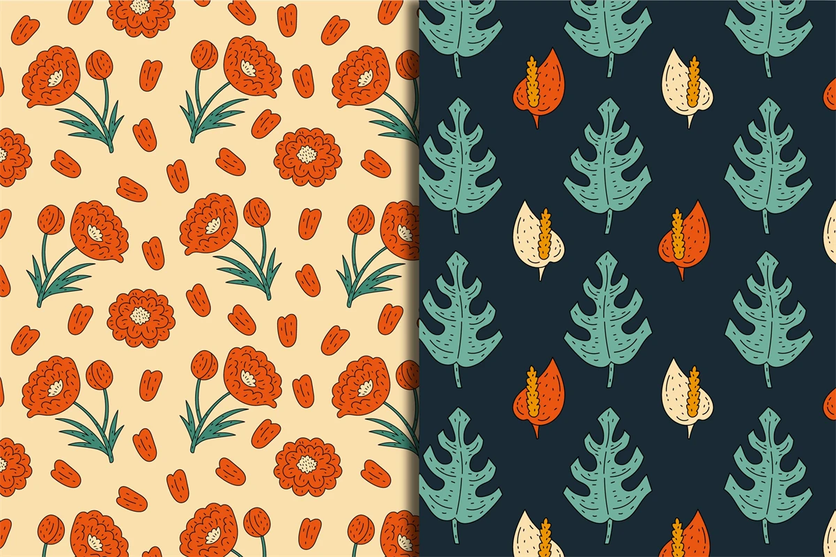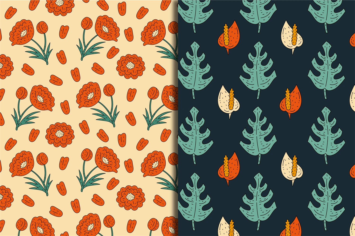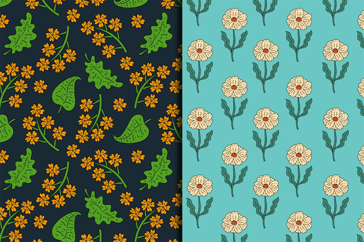 Vintage Flower Garden collection includes 8 trendy hand-drawn floral seamless patterns and digital papers with various hippie plats, blossoms and leaves. Cute retro wavy design with funky chamomile, peony, rose, bluebell, calla, poppy, tulip, twigs, monstera leaf, palm leaf and petals is perfect for fabric, textile, greeting card, scrapbooking, decoupage, cozy seasonal decoration. Botanical repeat vector illustration.