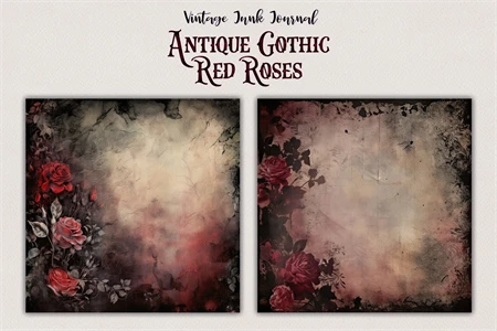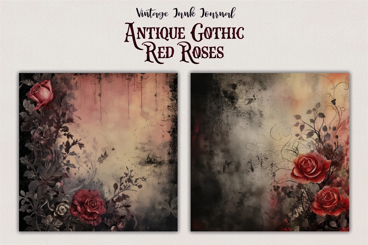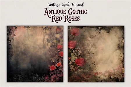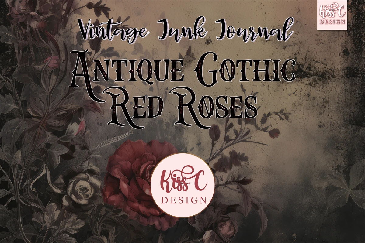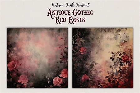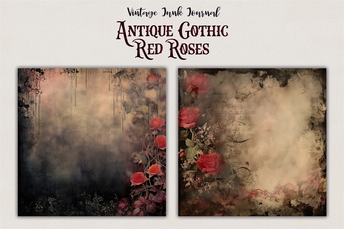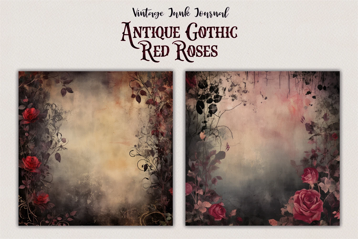 Antique junk journal digital papers - Vintage Gothic Red Roses Dark Background for wallpaper, planner, journal, Scrapbooking, and more.