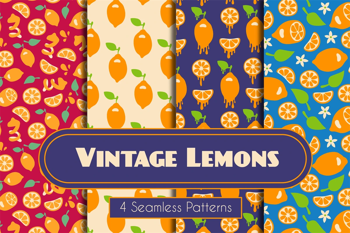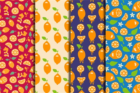 Fresh colorful endless backgrounds collection with lemons in trendy retro style. Vibrant colored citrus fruit elements are perfect for fabric, greeting cards, wrapping paper, summer seasonal decorations, kitchen, etc. Modern digital papers set with melting lemons, leaves, pieces, flowers. Bright nature seamless patterns.