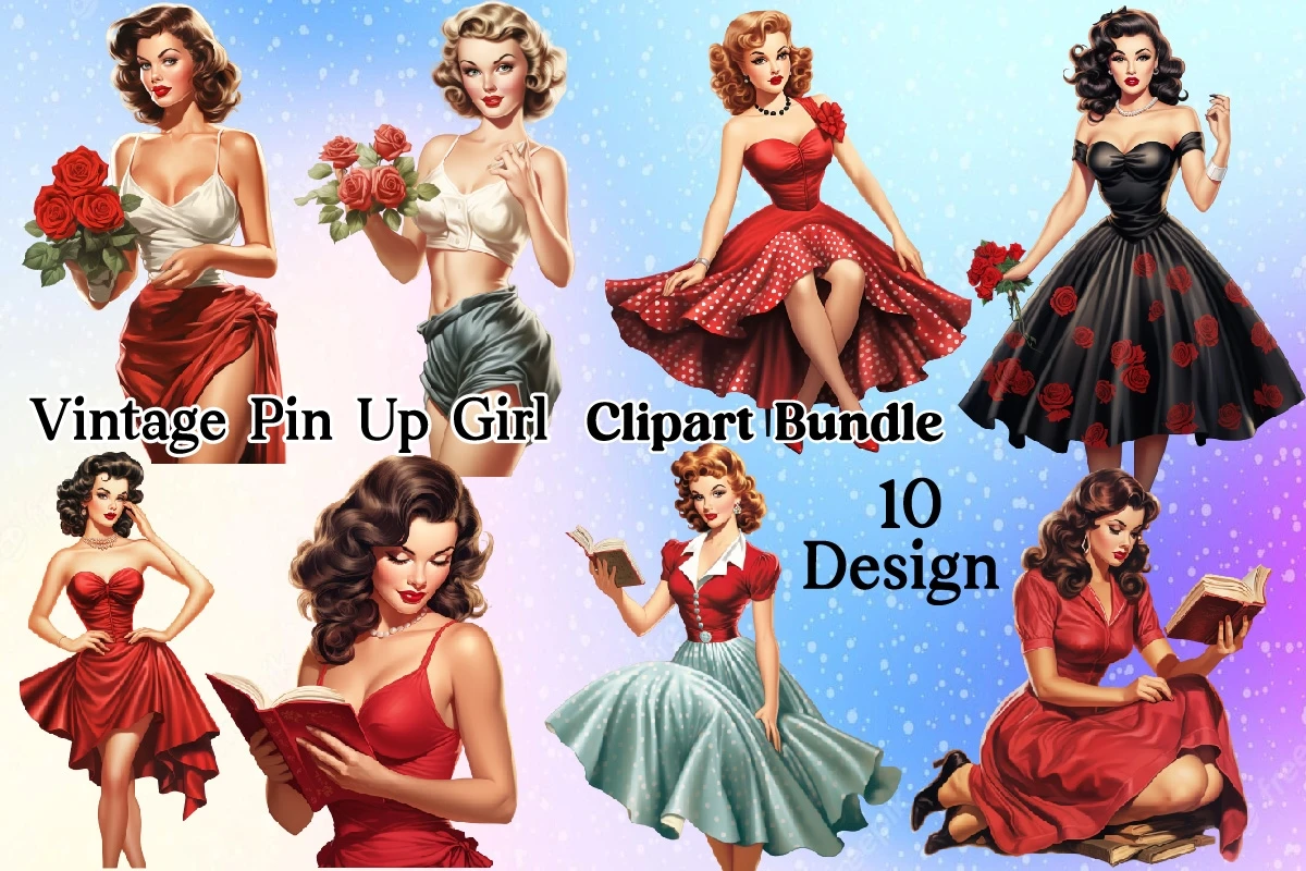 Watercolor Vintage Pin Up Girl Sublimation Design Bundle