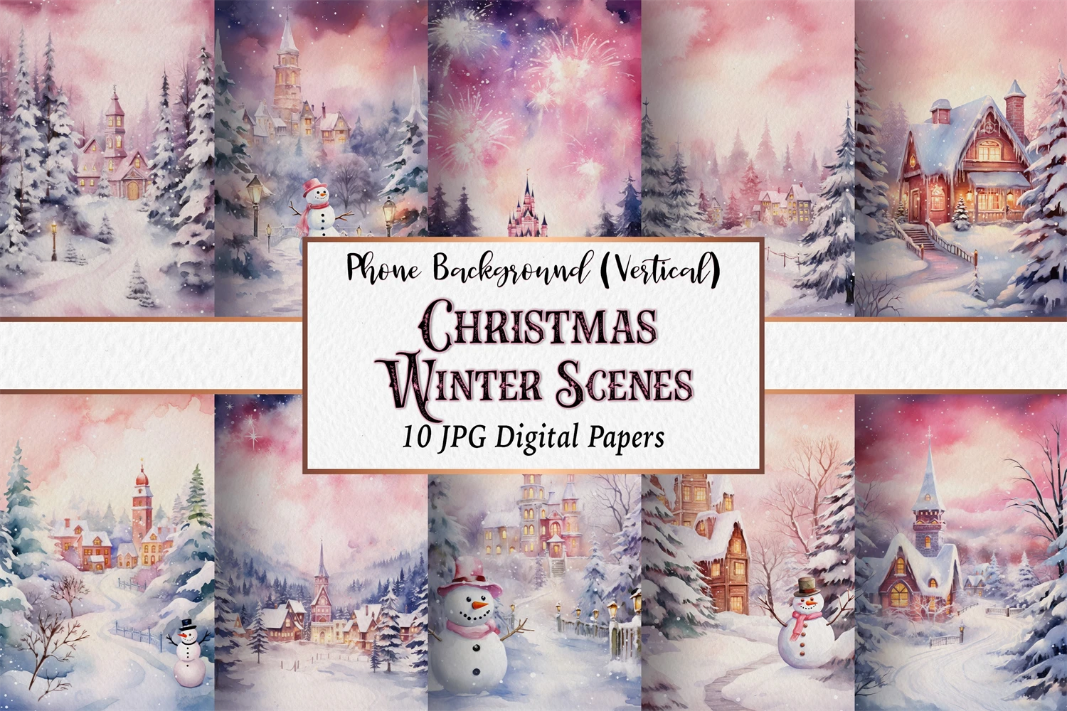 Seasonal junk journal horizontal digital papers with whimsical pink winter Christmas scene for wallpaper, planner, journal, Scrapbooking, and more.