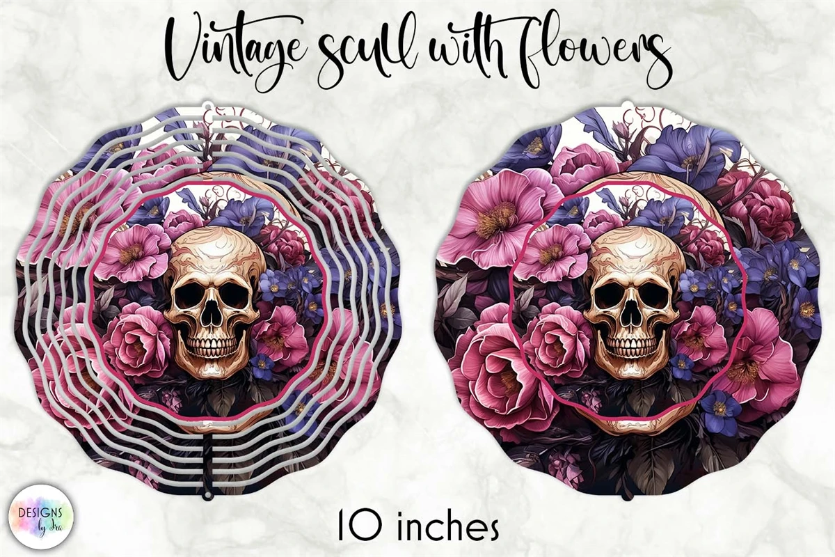 VINTAGE SCULL WITH FLOWERS WIND SPINNER.