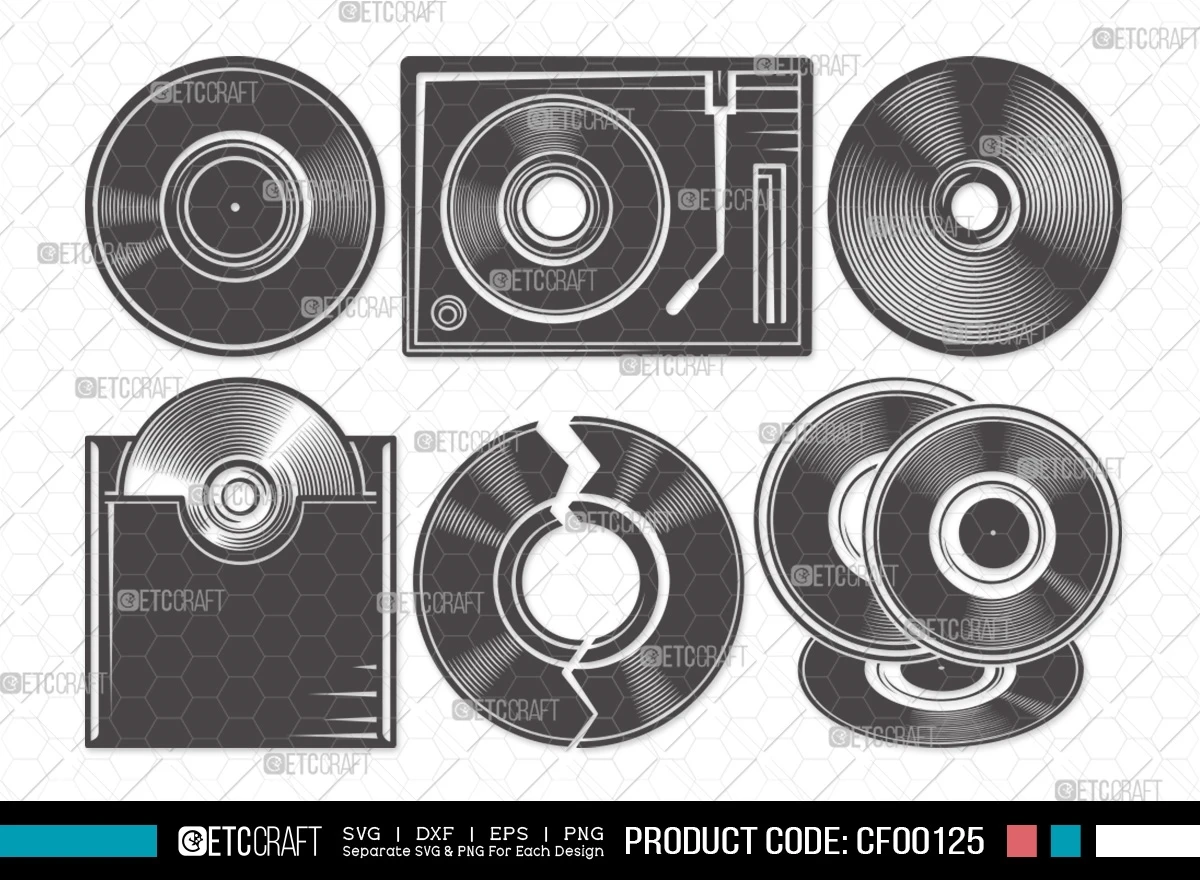 Dive into the groove of music nostalgia with our Vinyl Record Silhouette DJ Turntable LP Album Disc Cut File Bundle. This collection celebrates the timeless vinyl era, offering a range of silhouette clipart designs featuring vinyl records and turntables. Whether you're a music enthusiast or a design aficionado, this bundle is a melody of creativity waiting to be played in your projects.
