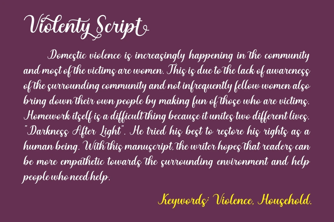 Violenty Script is a modern calligraphy font with the current handwriting style, this font is perfect for branding, wedding invites, magazines, mugs, business cards, quotes, posters, and more, you can try first if you want to buy this font.