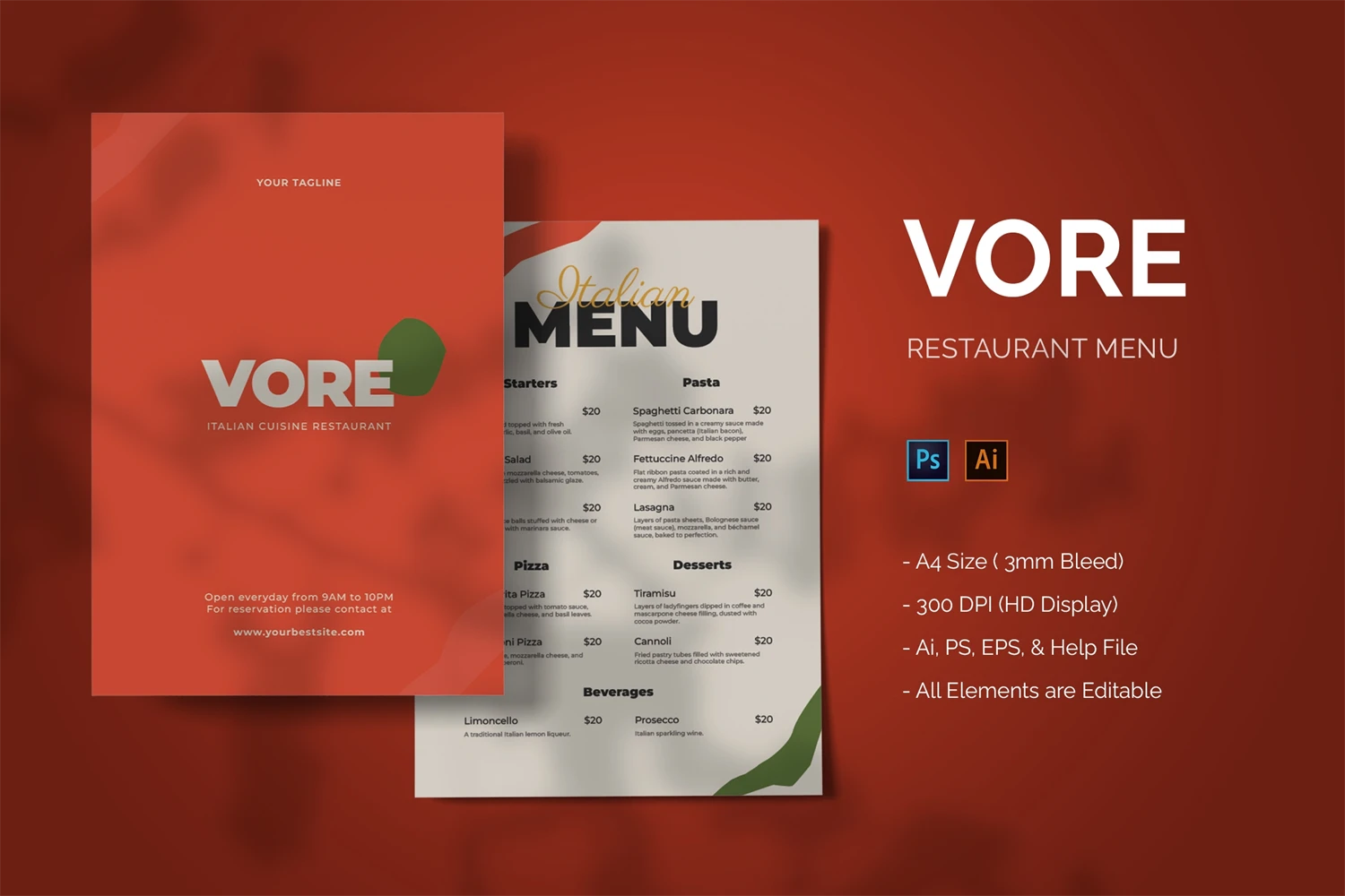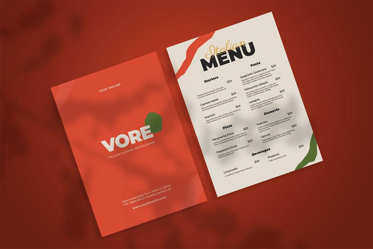 **Vore - Food Menu**. This template is excellent for your business and will make your customers interested, elegant, and easily editable according to your needs, this restaurant menu is perfect for, promos, cafes, hotels, and resort shops online. etc. I hope you enjoy this restaurant's menu