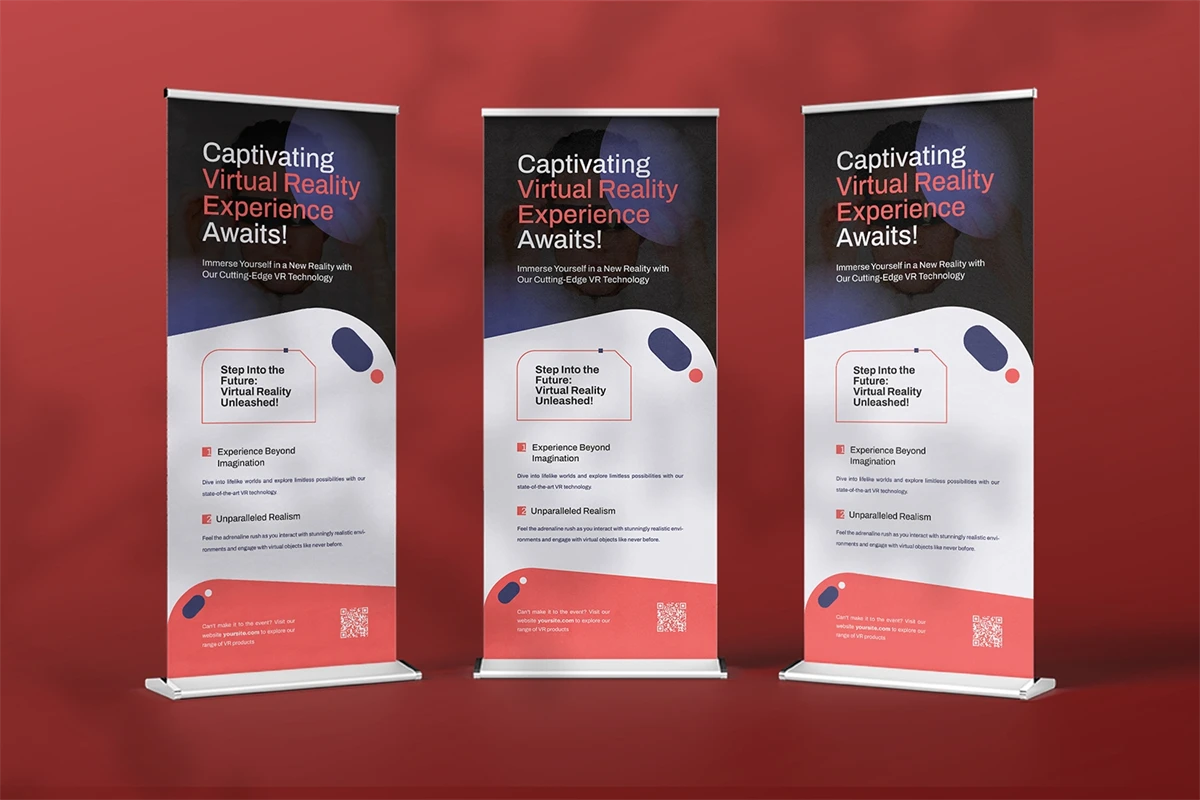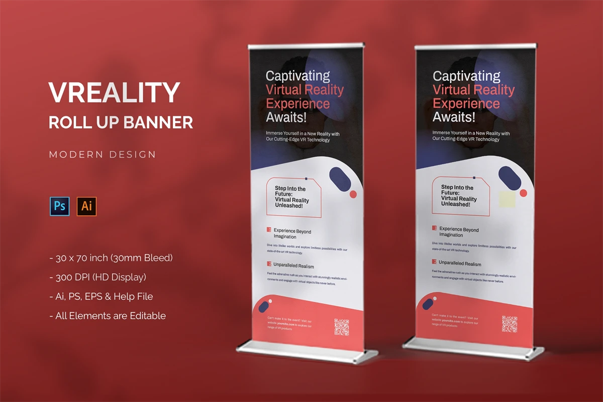 This is **Vreality - Roll Up Banner** Don't wait, get it right now! , All Your Roll-Up Banner Needs, Professional or Personal. This stylish and adaptable template is perfect for your company's promotional materials.