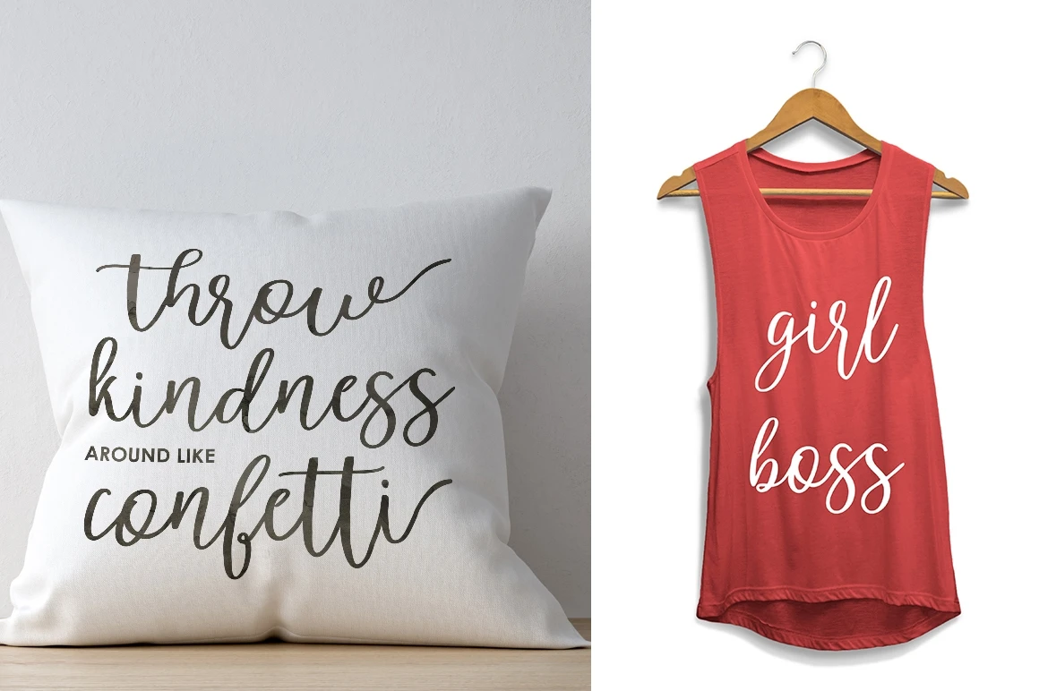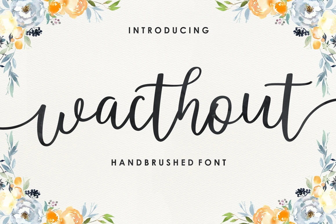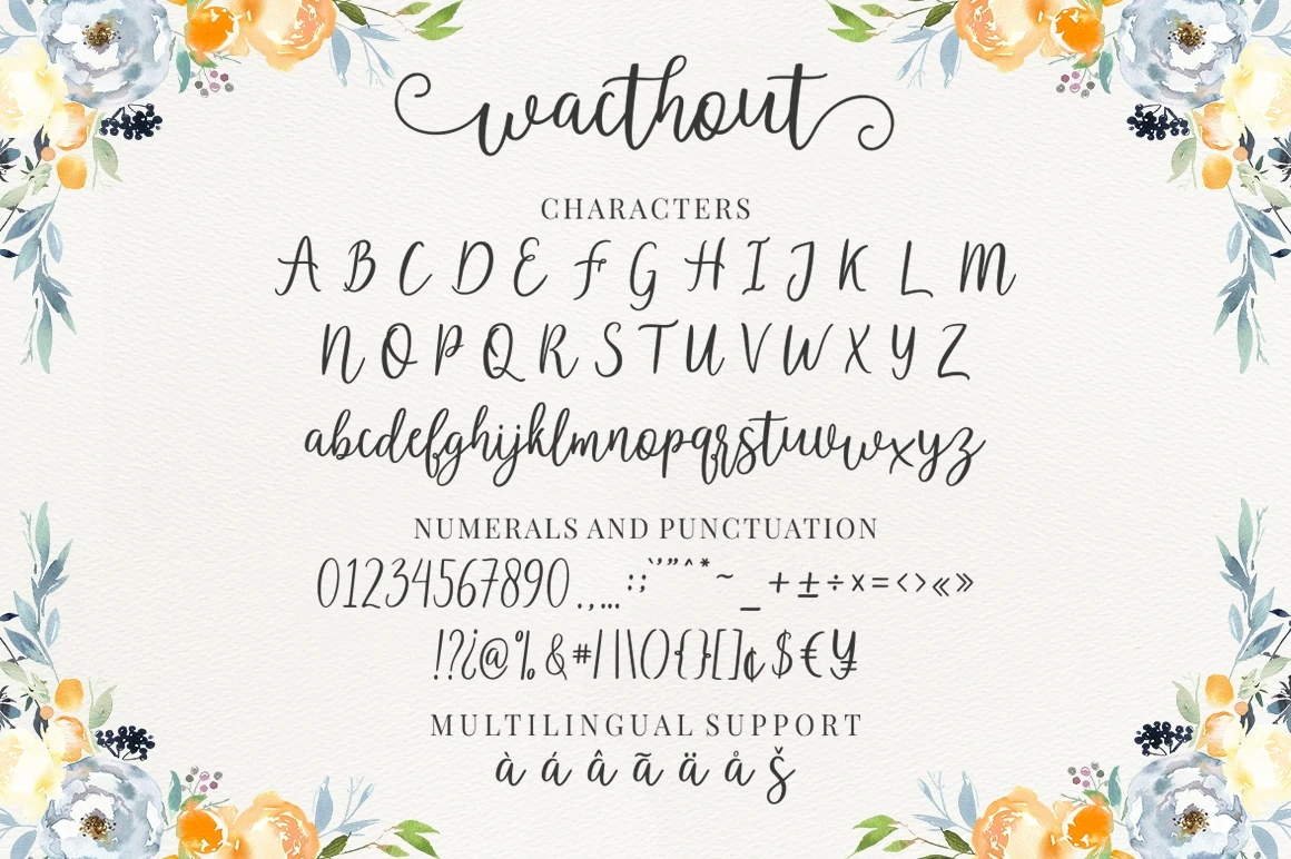 Wacthout Script is a new modern script font with an irregular baseline. Trendy and feminine style. Wacthout looks lovely on wedding invitations, thank you cards, quotes, greeting cards, logos, business cards and more. Perfect for using in ink or watercolour. Including initial and terminal letters, alternates and multiple language support.