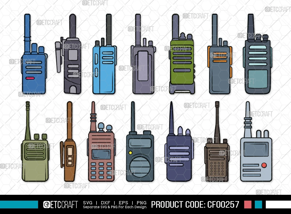 Whether you're promoting communication services, creating educational materials, or simply adding a touch of professionalism and connectivity to your design projects, our Walkie Talkie Clipart and Portable Communication Radio SVG Cut File Bundle is the ultimate solution. Elevate your visuals with these high-quality graphics and take your projects to the next level. Get started with this bundle today!
